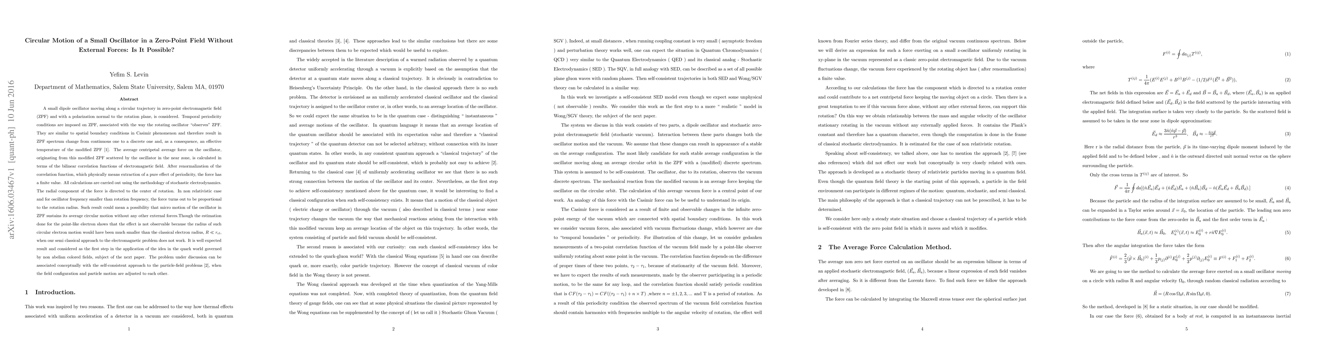 A small dipole oscillator moving along a circular trajectory in zero-point electromagnetic field ( ZPF ) and with a polarization normal to the rotation plane, is considered. Temporal periodicity conditions are imposed on ZPF, associated with the way the rotating oscillator observes ZPF. They are similar to spatial boundary conditions in Casimir phenomenon and therefore result in ZPF spectrum change from continuous one to a discrete one and, as a consequence, an effective temperature of the modified ZPF (Y. S. Levin ). The average centripetal average force on the oscillator, originating from this modified ZPF scattered by the oscillator in the near zone, is calculated in terms of the bilinear correlation functions of electromagnetic field. After renormalization of the correlation function, which physically means extraction of a pure effect of periodicity, the force has a finite value. All calculations are carried out using the methodology of stochastic electrodynamics. The radial component of the force is directed to the center of rotation. In non relativistic case and for oscillator frequency smaller than rotation frequency, the force turns out to be proportional to the rotation radius. Such result could mean a possibility that micro motion of the oscillator in ZPF sustains its average circular motion without any other external forces.Though the estimation done for the point-like electron shows that the effect is not observable because the radius of such circular electron motion would have been much smaller than the classical electron radius when our semi classical approach to the electromagnetic problem does not work. It is well expected result and considered as the first step in the application of the idea in the quark world governed by non abelian colored fields, subject of the next paper.