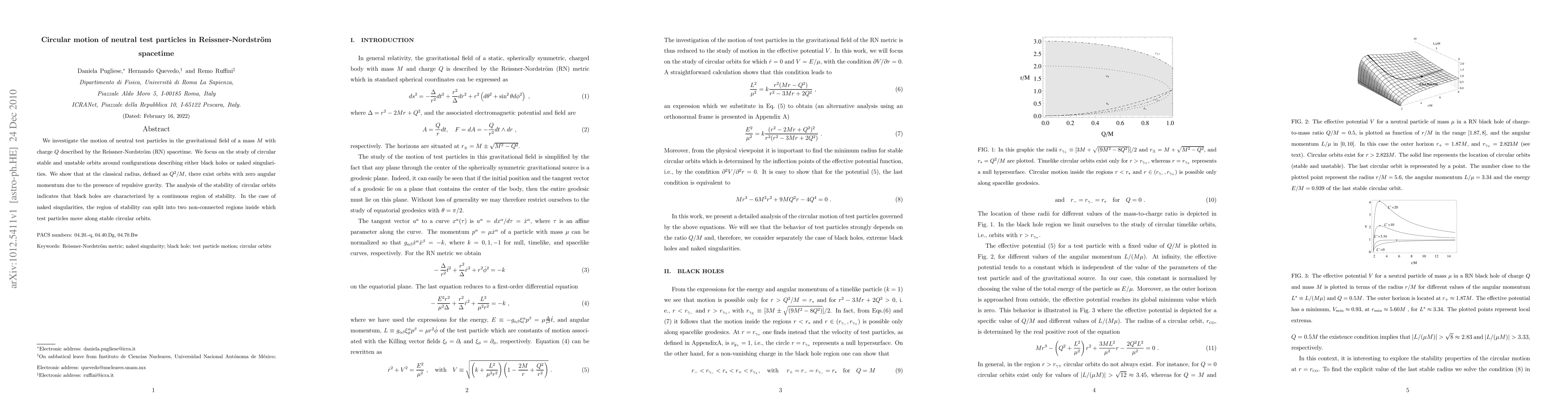 This paper examines the circular motion of neutral test particles in the Reissner-Nordström spacetime, revealing the existence of stable and unstable orbits around both black holes and naked singularities. It finds that black holes exhibit a continuous stability region, while naked singularities may split this region into two separate areas.