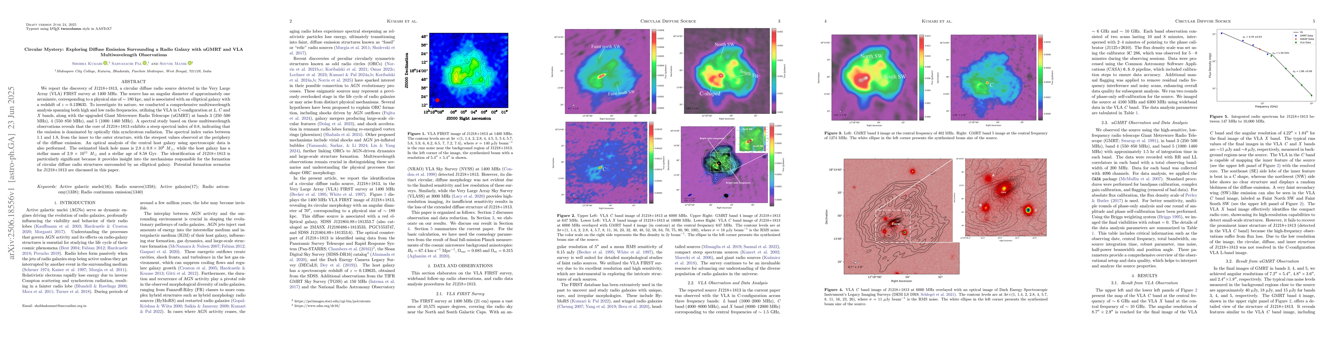We report the discovery of J1218+1813, a circular diffuse radio source detected in the Very Large Array (VLA) FIRST survey at 1400 MHz. The source has an angular diameter of approximately one arcminute, corresponding to a physical size of ~180 kpc, and is associated with an elliptical galaxy with a redshift of z = 0.139635. To investigate its nature, we conducted a comprehensive multiwavelength analysis spanning both high and low radio frequencies, utilizing the VLA in C-configuration at L, C and X bands, along with the upgraded Giant Metrewave Radio Telescope (uGMRT) at bands 3 (250-500 MHz), 4 (550-850 MHz), and 5 (1000-1460 MHz). A spectral study based on these multiwavelength observations reveals that the core of J1218+1813 exhibits a steep spectral index of 0.8, indicating that the emission is dominated by optically thin synchrotron radiation. The spectral index varies between 1.1 and 1.8, from the inner to the outer structure, with the steepest values observed at the periphery of the diffuse emission. An optical analysis of the central host galaxy using spectroscopic data is also performed. The estimated black hole mass is $2.8 \pm 0.8 \times 10^{8}$ M${_\odot}$, while the host galaxy has a stellar mass of 2.9 $\times$ 10$^{11}$ M${_\odot}$ and a stellar age of 8.58 Gyr. The identification of J1218+1813 is particularly significant because it provides insight into the mechanisms responsible for the formation of circular diffuse radio structures surrounded by an elliptical galaxy. Potential formation scenarios for J1218+1813 are discussed in this paper.