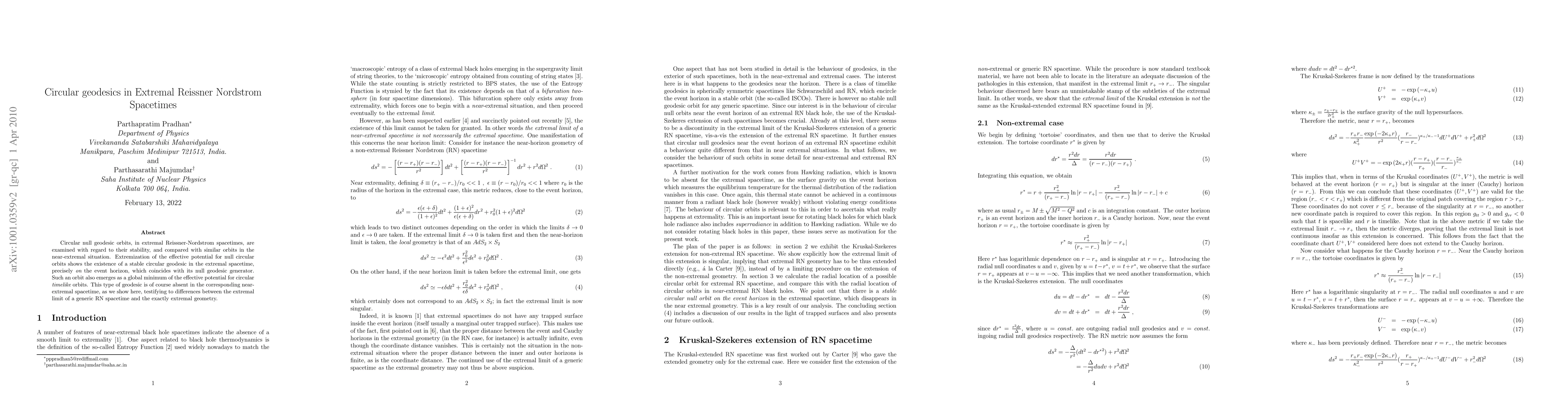 Circular null geodesic orbits, in extremal Reissner-Nordstrom spacetimes, are examined with regard to their stability, and compared with similar orbits in the near-extremal situation. Extremization of the effective potential for null circular orbits shows the existence of a stable circular geodesic in the extremal spacetime, precisely {\it on} the event horizon, which coincides with its null geodesic generator. Such an orbit also emerges as a global minimum of the effective potential for circular {\it timelike} orbits. This type of geodesic is of course absent in the corresponding near-extremal spacetime, as we show here, testifying to differences between the extremal limit of a generic RN spacetime and the exactly extremal geometry.