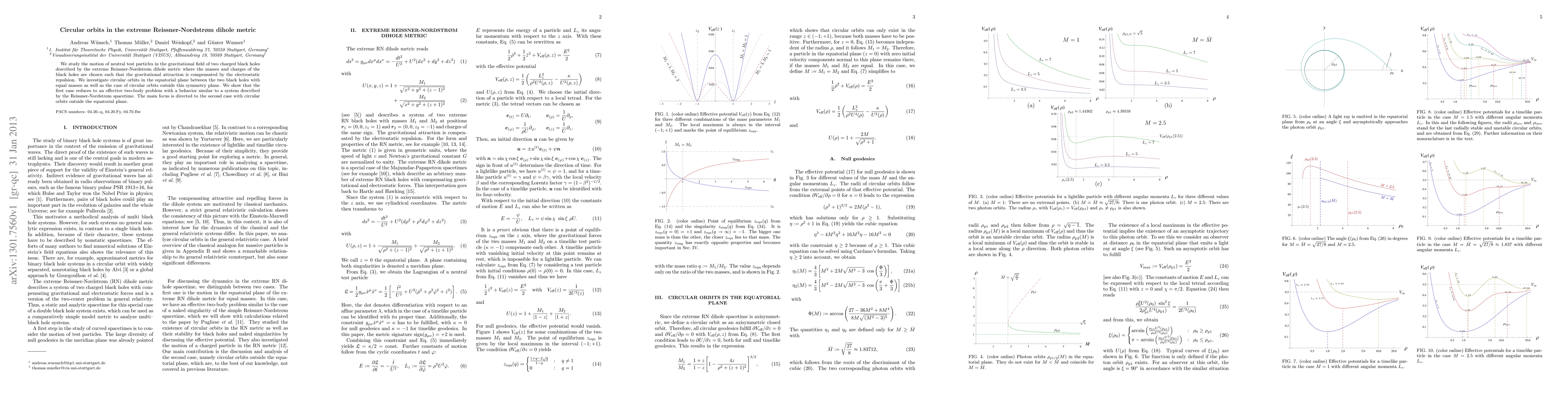 We study the motion of neutral test particles in the gravitational field of two charged black holes described by the extreme Reissner-Nordstr{\o}m dihole metric where the masses and charges of the black holes are chosen such that the gravitational attraction is compensated by the electrostatic repulsion. We investigate circular orbits in the equatorial plane between the two black holes with equal masses as well as the case of circular orbits outside this symmetry plane. We show that the first case reduces to an effective two-body problem with a behavior similar to a system described by the Reissner-Nordstr{\o}m spacetime. The main focus is directed to the second case with circular orbits outside the equatorial plane.
