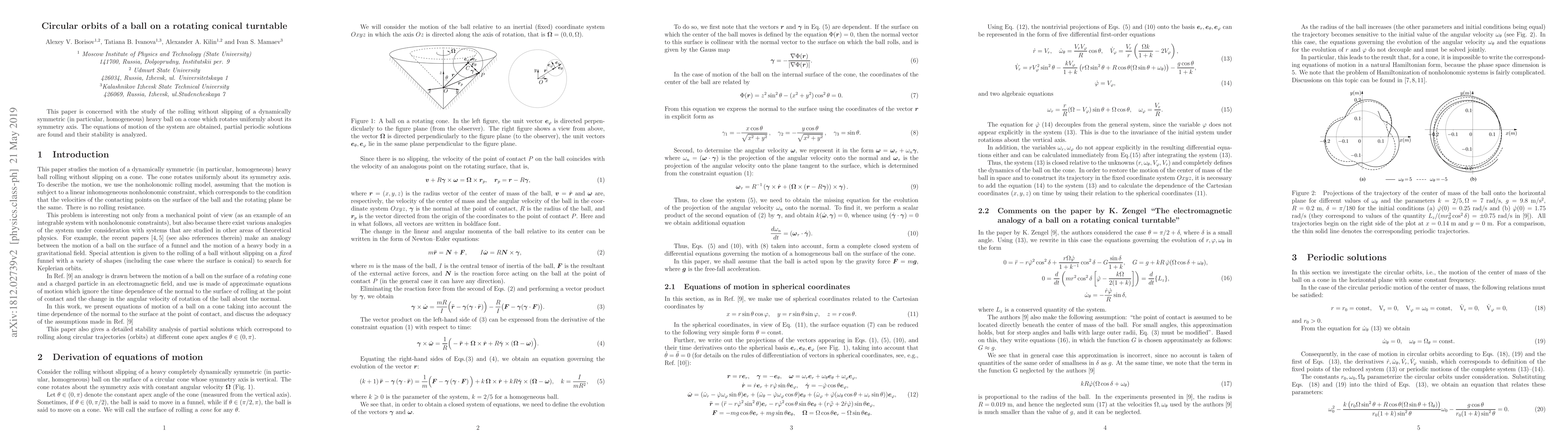 Researchers studied a heavy ball rolling without slipping on a rotating conical turntable, finding partial periodic solutions that were stable under certain conditions.