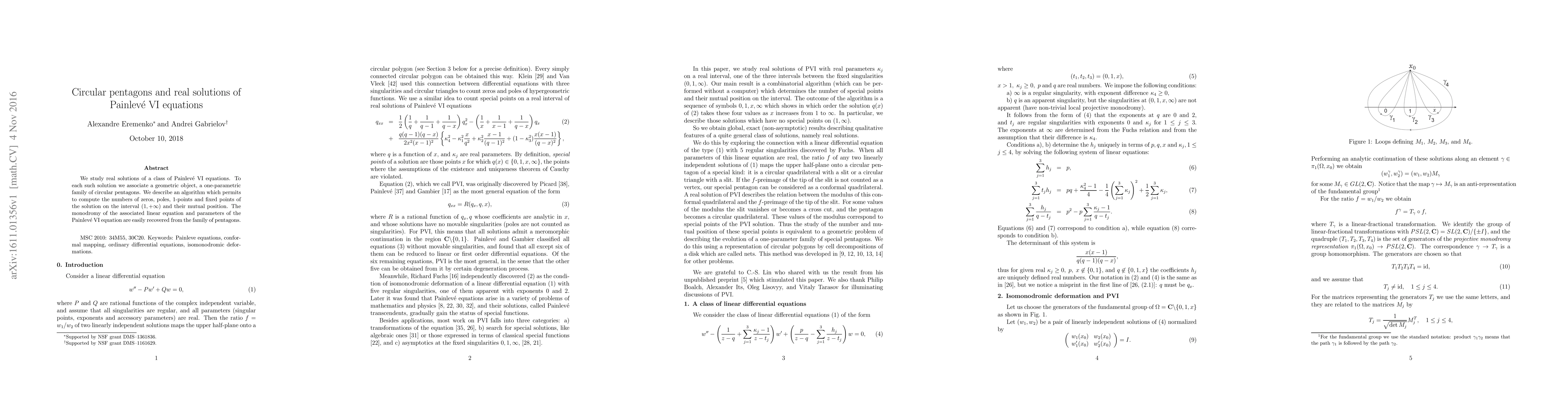This paper investigates real solutions of Painleve VI equations, associating each solution with a one-parametric family of circular pentagons. It presents an algorithm to compute the zeros, poles, 1-points, and fixed points of the solutions on the interval x>1 and their configurations.