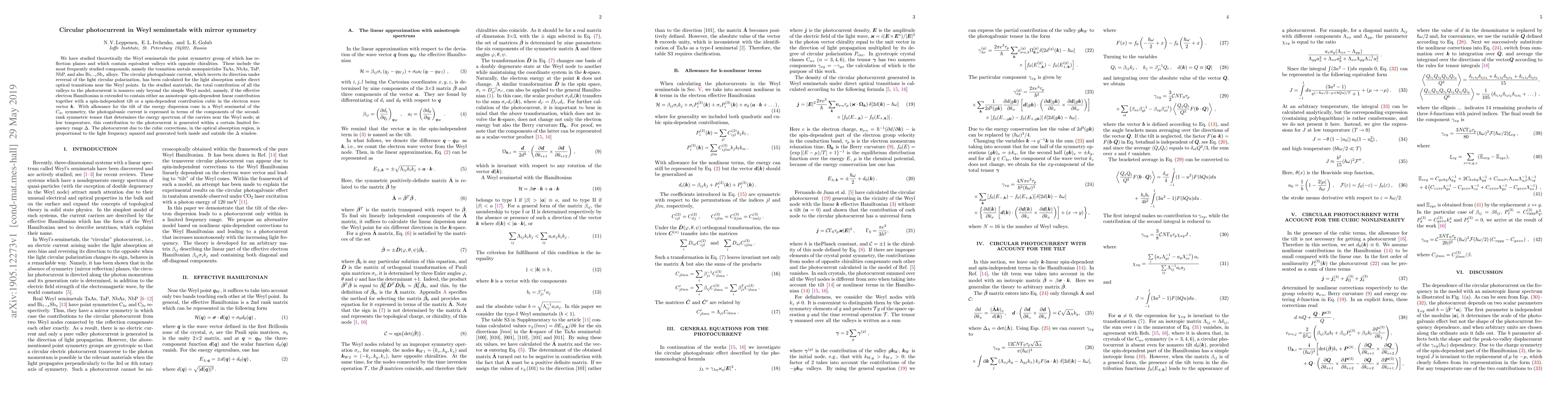 This paper theoretically investigates Weyl semimetals with mirror symmetry, showing that circular photocurrents occur beyond simple Weyl models when the electron Hamiltonian includes anisotropic spin-dependent terms or cubic spin-dependent k-vector contributions. The photogalvanic effect depends on energy spectrum components and is significant within a limited frequency range.