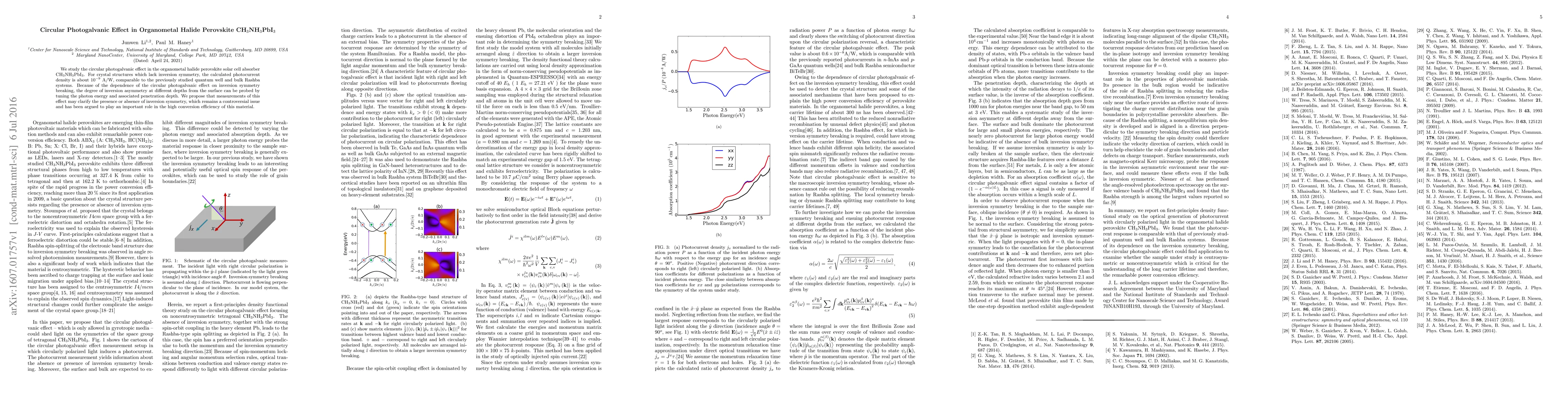 This paper investigates the circular photogalvanic effect in the perovskite material CH$_3$NH$_3$PbI$_3$, finding a photocurrent density of $10^{-9}$ A/W. The study suggests that this effect can be used to probe inversion asymmetry, potentially clarifying its role in the material's high efficiency.