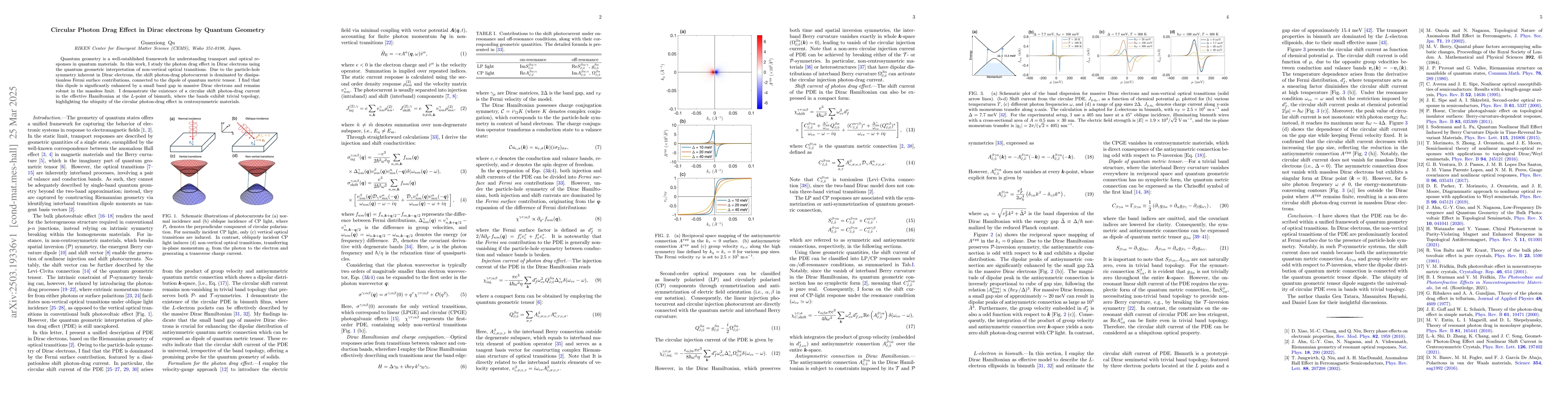 This work contributes to understanding transport and optical responses in quantum materials, particularly Dirac electrons, with implications for photon drag effects and quantum geometry.