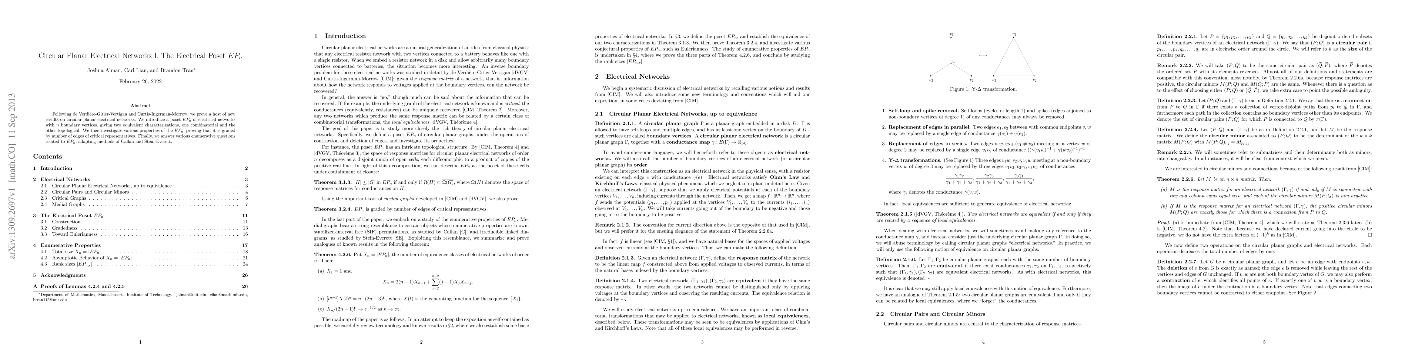 Following de Verdi\`{e}re-Gitler-Vertigan and Curtis-Ingerman-Morrow, we prove a host of new results on circular planar electrical networks. We introduce a poset EP_{n} of electrical networks with n boundary vertices, giving two equivalent characterizations, one combinatorial and the other topological. We then investigate various properties of the EP_{n}, proving that it is graded by number of edges of critical representatives. Finally, we answer various enumerative questions related to EP_{n}, adapting methods of Callan and Stein-Everett.