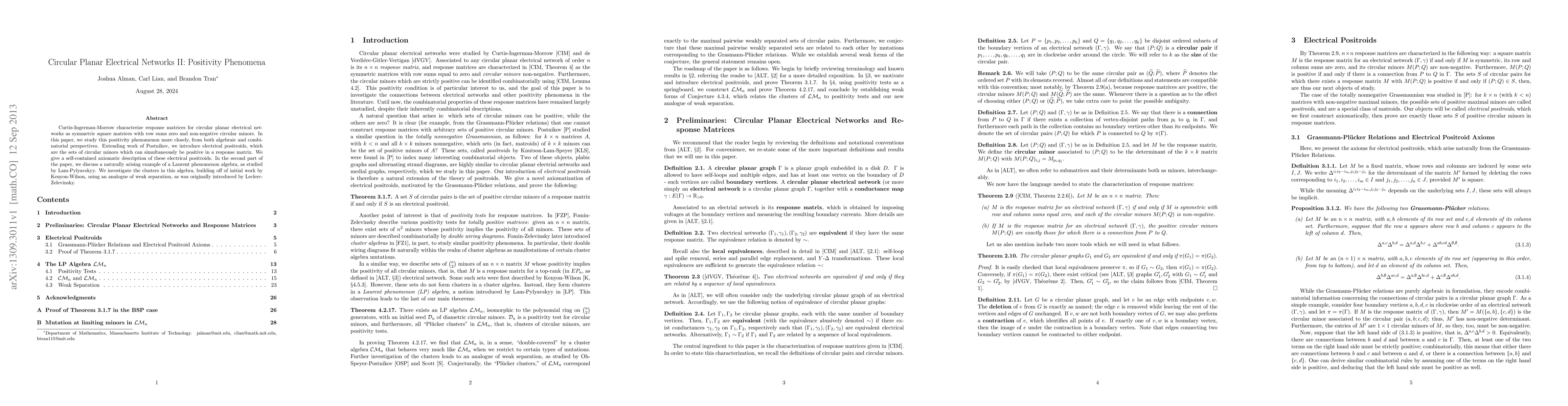 This paper explores the positivity phenomena in circular planar electrical networks, introducing electrical positroids as sets of circular minors that can be simultaneously positive. It provides an axiomatic description and discusses a Laurent phenomenon algebra, investigating its clusters using an analogue of weak separation.