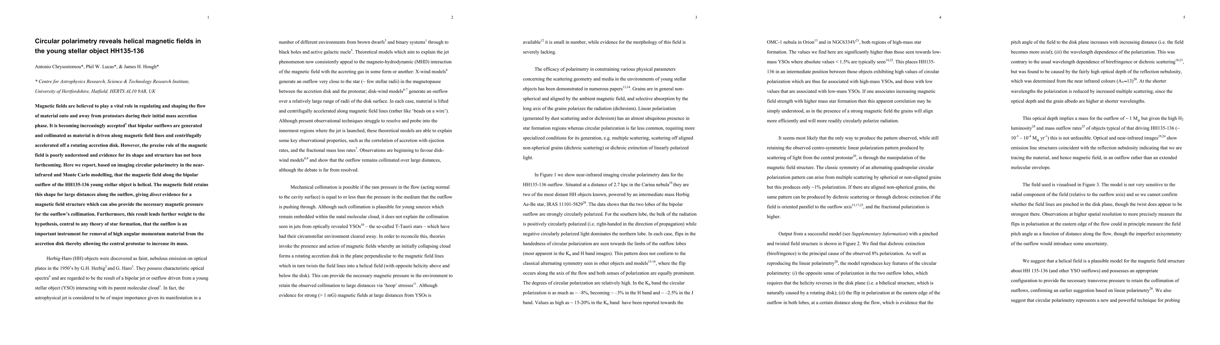 This study uses near-infrared circular polarimetry and Monte Carlo modelling to reveal that the magnetic field in the HH 135-136 young stellar object's bipolar outflow is helical, supporting the theory that outflows play a crucial role in star formation by removing angular momentum from the accretion disk.
