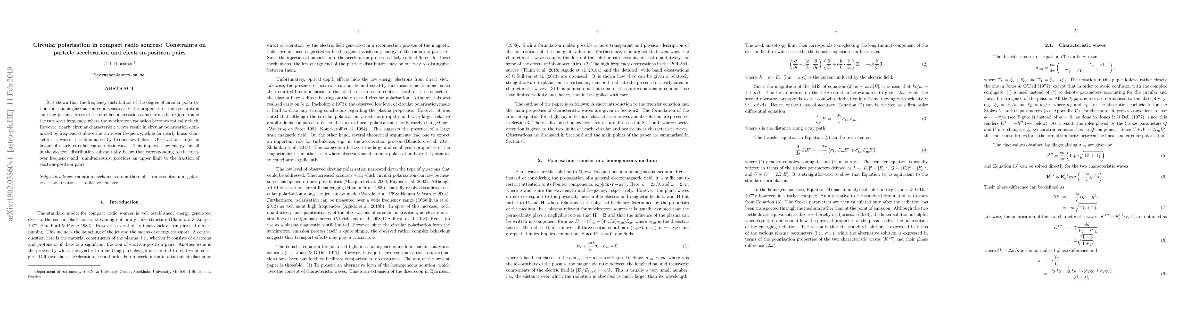 It is shown that the frequency distribution of the degree of circular polarisation for a homogeneous source is sensitive to the properties of the synchrotron emitting plasma. Most of the circular polarisation comes from the region around the turn-over frequency, where the synchrotron radiation becomes optically thick. However, nearly circular characteristic waves result in circular polarisation dominated by frequencies above the turn-over frequency, while for nearly linear characteristic waves it is dominated by frequencies below. Observations argue in favour of nearly circular characteristic waves. This implies a low energy cut-off in the electron distribution substantially below that corresponding to the turn-over frequency and, simultaneously, provides an upper limit to the fraction of electron-positron pairs.