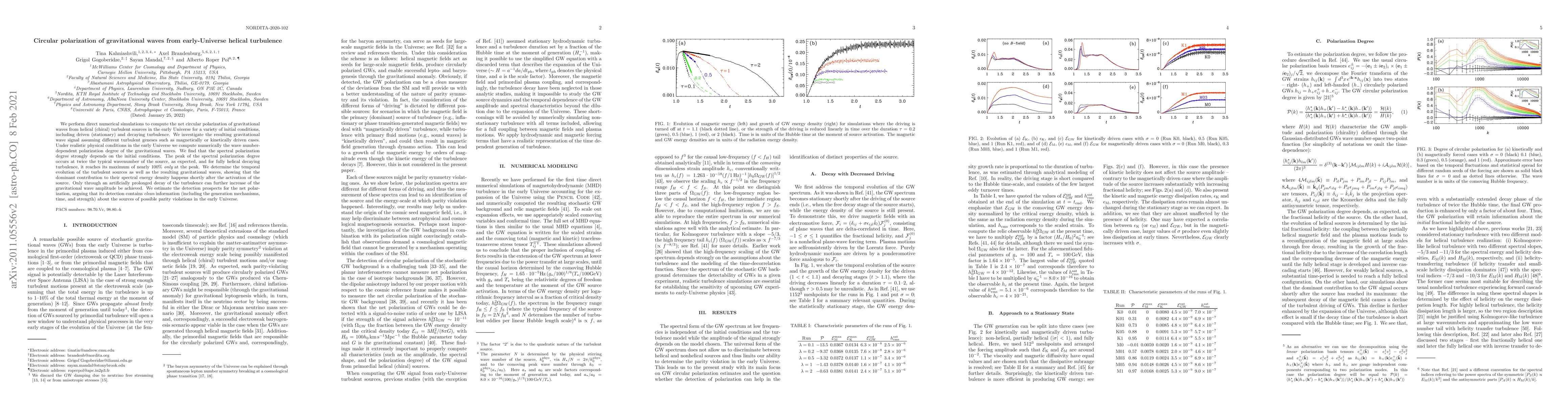 This paper investigates the net circular polarization of gravitational waves from helical turbulence in the early Universe, finding that the spectral polarization degree depends on initial conditions and peaks at twice the source wavenumber. The study suggests that detecting this polarization could provide insights into early Universe parity violations.