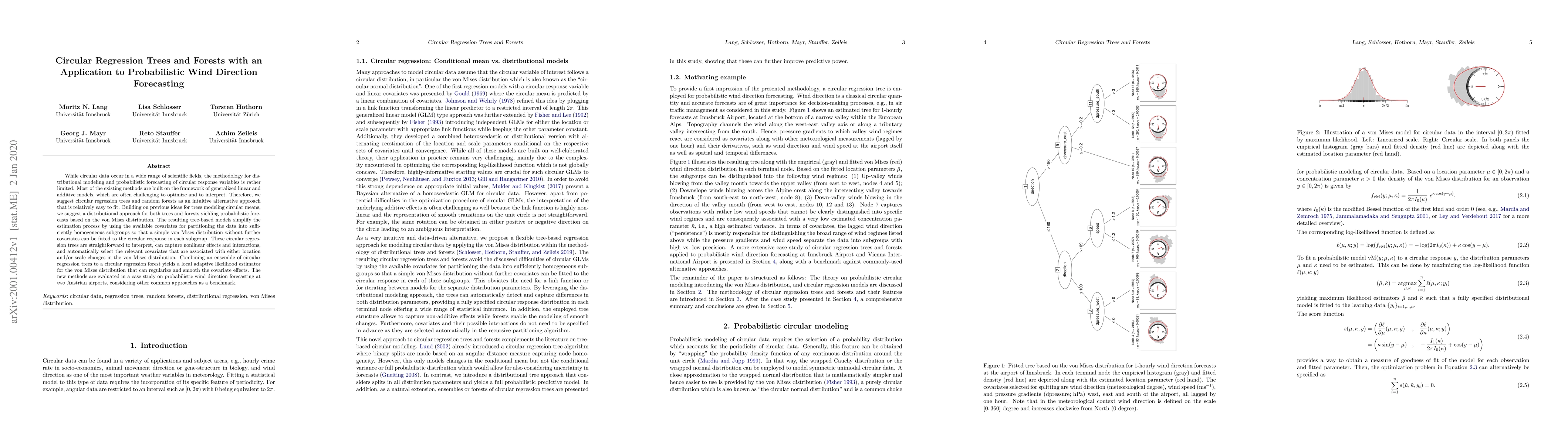 This paper proposes circular regression trees and forests for probabilistic forecasting of circular response variables, specifically applied to wind direction forecasting. The method offers an intuitive, interpretable, and effective alternative to traditional generalized linear models, leveraging the von Mises distribution for probabilistic predictions.