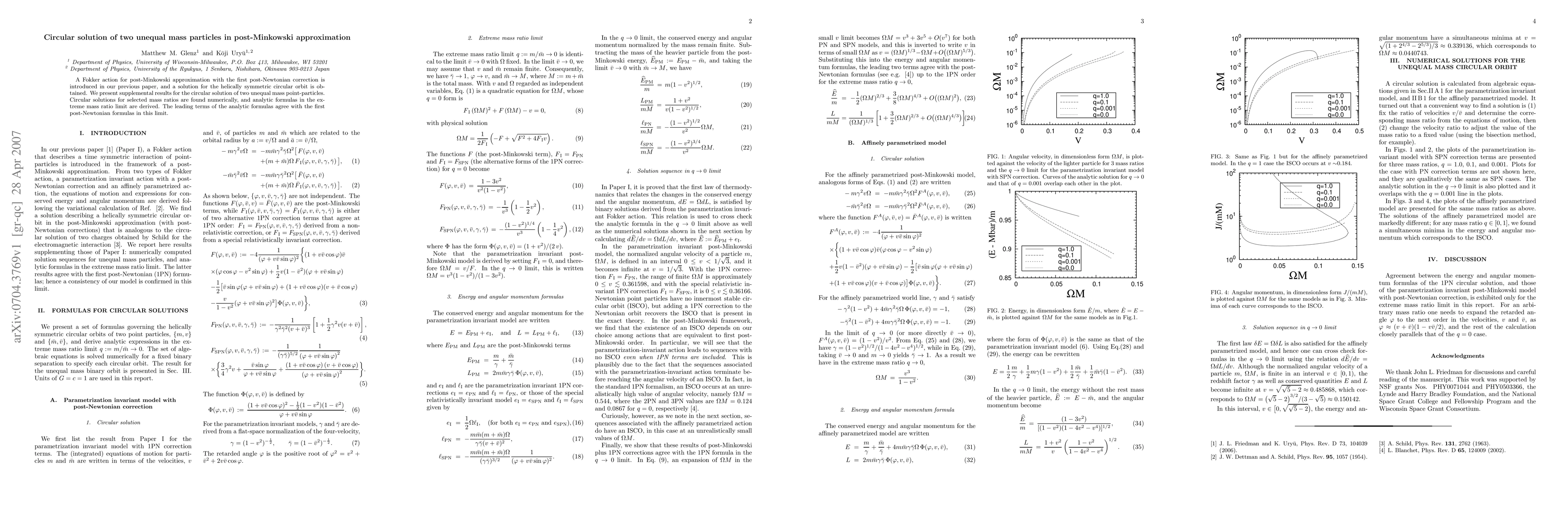 A Fokker action for post-Minkowski approximation with the first post-Newtonian correction is introduced in our previous paper, and a solution for the helically symmetric circular orbit is obtained. We present supplemental results for the circular solution of two unequal mass point-particles. Circular solutions for selected mass ratios are found numerically, and analytic formulas in the extreme mass ratio limit are derived. The leading terms of the analytic formulas agree with the first post-Newtonian formulas in this limit.