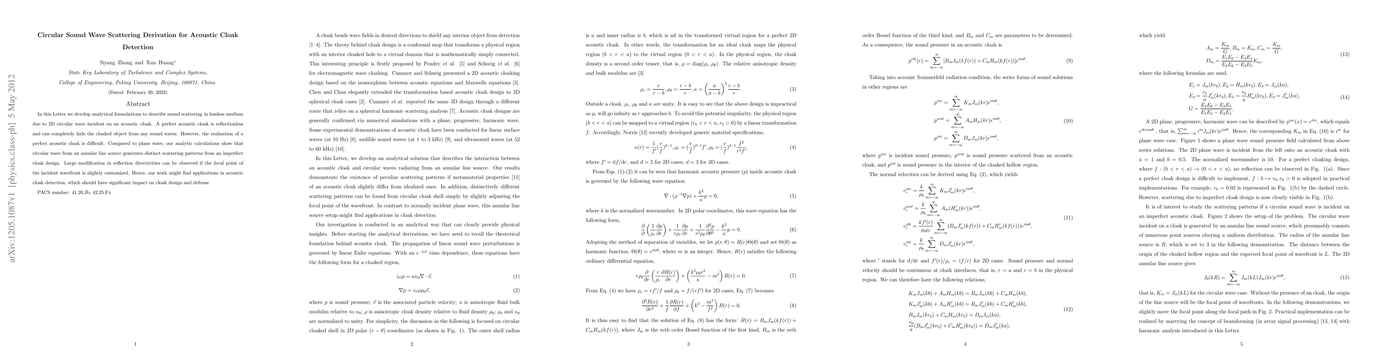 In this Letter we develop analytical formulations to describe sound scattering in lossless medium due to 2D circular wave incident on an acoustic cloak. A perfect acoustic cloak is reflectionless and can completely hide the cloaked object from any sound waves. However, the realization of a perfect acoustic cloak is difficult. Compared to plane wave, our analytic calculations show that circular wave from an annular line source generates distinct scattering patterns from an imperfect cloak design. Large modification in reflection directivities can be observed if the focal point of the incident wavefront is slightly customized. Hence, our work might find applications in acoustic cloak detection, which should have significant impact on cloak design and defense.