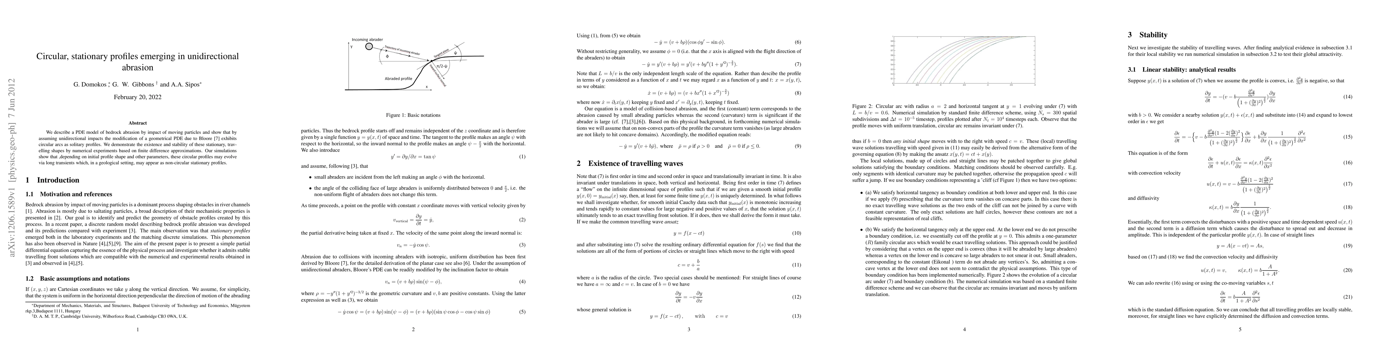 We describe a PDE model of bedrock abrasion by impact of moving particles and show that by assuming unidirectional impacts the modification of a geometrical PDE due to Bloore exhibits circular arcs as solitary profiles. We demonstrate the existence and stability of these stationary, travelling shapes by numerical experiments based on finite difference approximations. Our simulations show that, depending on initial profile shape and other parameters, these circular profiles may evolve via long transients which, in a geological setting, may appear as non-circular stationary profiles.