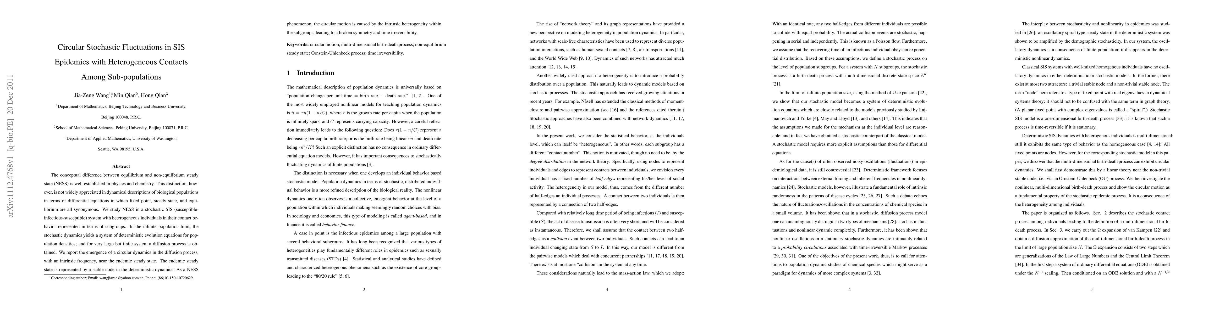 Research finds that in a model of infectious diseases with diverse contact behaviors, populations can exhibit circular motions near an endemic steady state due to intrinsic heterogeneity, leading to time irreversibility. This phenomenon occurs despite the system's deterministic evolution equations.