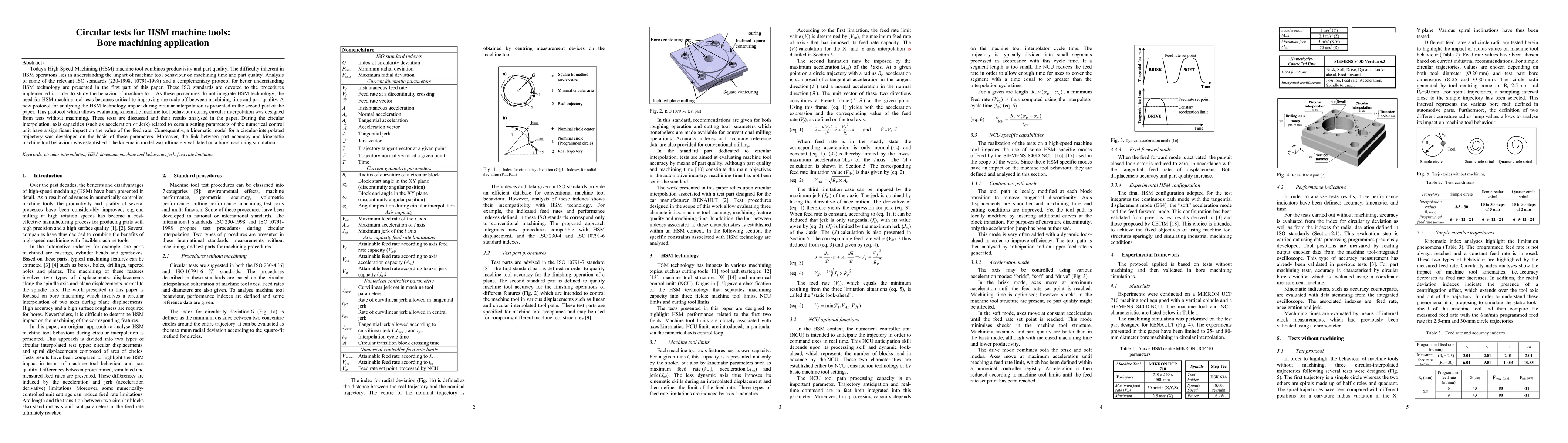 Today's High-Speed Machining (HSM) machine tool combines productivity and part quality. The difficulty inherent in HSM operations lies in understanding the impact of machine tool behaviour on machining time and part quality. Analysis of some of the relevant ISO standards (230-1998, 10791-1998) and a complementary protocol for better understanding HSM technology are presented in the first part of this paper. These ISO standards are devoted to the procedures implemented in order to study the behavior of machine tool. As these procedures do not integrate HSM technology, the need for HSM machine tool tests becomes critical to improving the trade-off between machining time and part quality. A new protocol for analysing the HSM technology impact during circular interpolation is presented in the second part of the paper. This protocol which allows evaluating kinematic machine tool behaviour during circular interpolation was designed from tests without machining. These tests are discussed and their results analysed in the paper. During the circular interpolation, axis capacities (such as acceleration or Jerk) related to certain setting parameters of the numerical control unit have a significant impact on the value of the feed rate. Consequently, a kinematic model for a circular-interpolated trajectory was developed on the basis of these parameters. Moreover, the link between part accuracy and kinematic machine tool behaviour was established. The kinematic model was ultimately validated on a bore machining simulation.