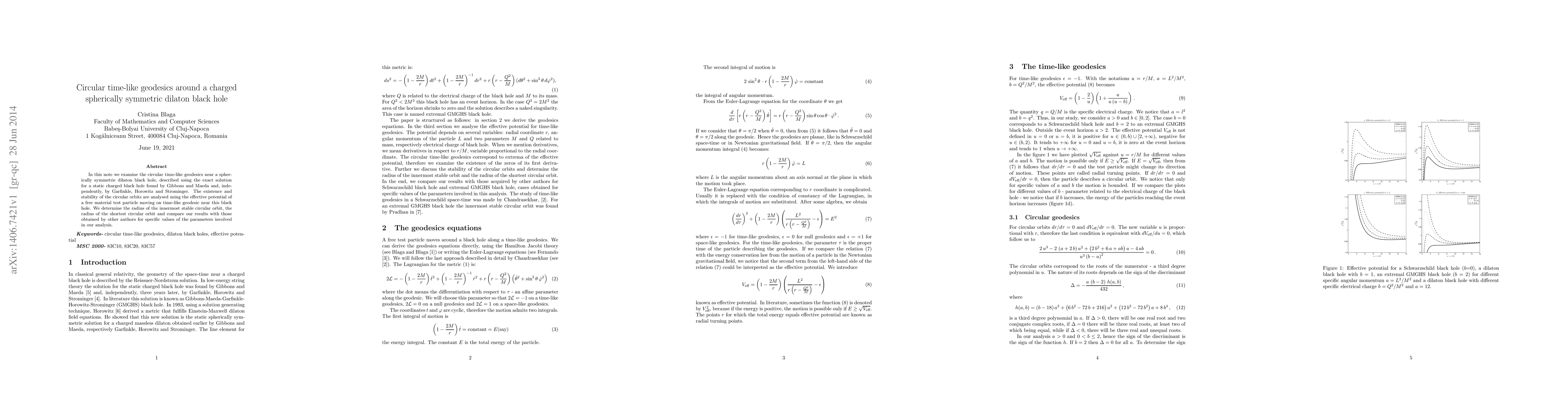 In this note we examine the circular time-like geodesics near a spherically symmetric dilaton black hole, described using the exact solution for a static charged black hole found by Gibbons and Maeda and, independently, by Garfinkle, Horowitz and Strominger. The existence and stability of the circular orbits are analysed using the effective potential of a free material test particle moving on time-like geodesic near this black hole. We determine the radius of the innermost stable circular orbit, the radius of the shortest circular orbit and compare our results with those obtained by other authors for specific values of the parameters involved in our analysis.