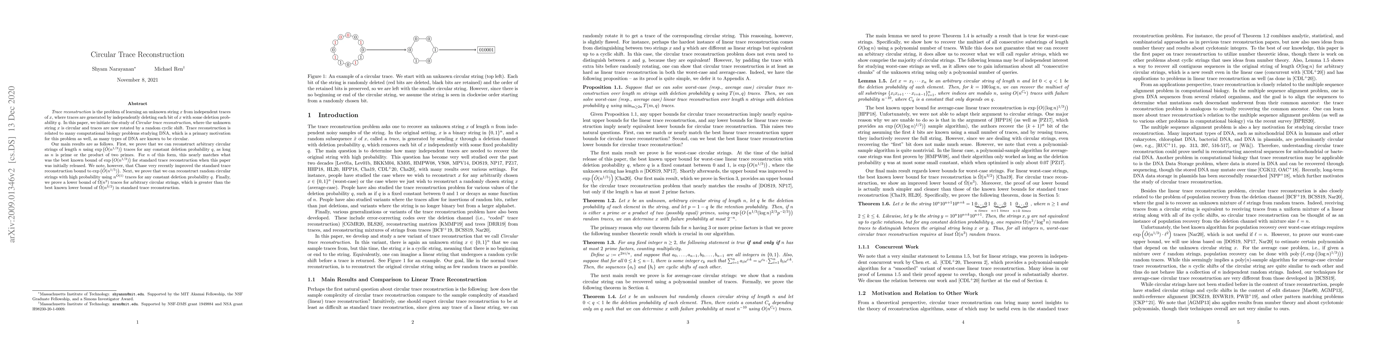 This paper studies Circular trace reconstruction, where the goal is to reconstruct an unknown circular string from rotated traces with deletions. The authors show that $\exp\big(\tilde{O}(n^{1/3})\big)$ traces are sufficient for reconstructing arbitrary circular strings of length $n$ under certain conditions, and $n^{O(1)}$ traces for random strings, while establishing a lower bound of $\tilde{\Omega}(n^3)$ traces.