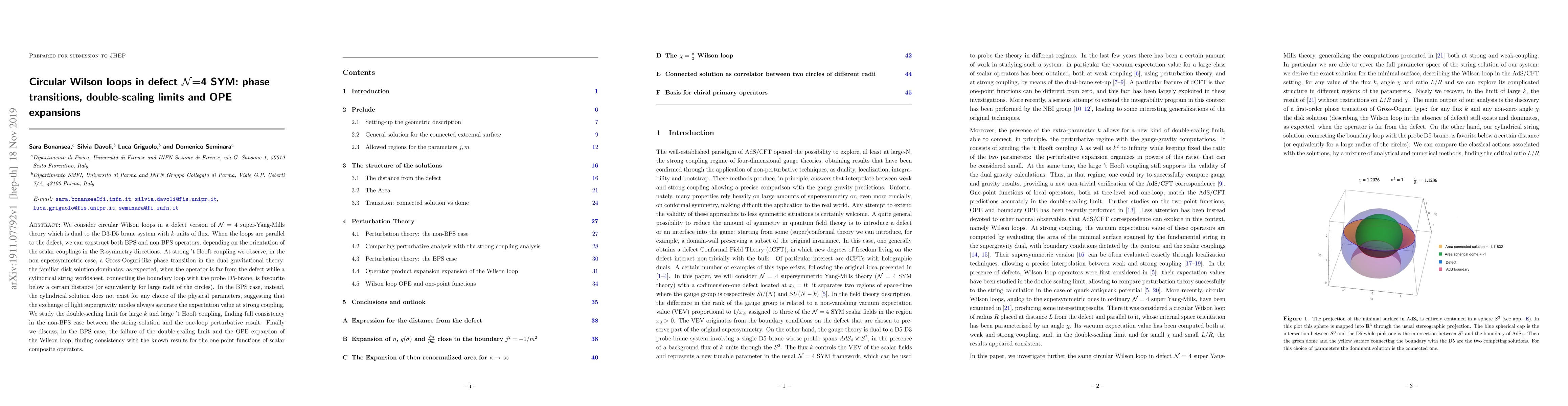 This paper investigates circular Wilson loops in a defect version of $ u=4$ SYM theory, finding a phase transition at strong 't Hooft coupling and consistent results between string solutions and one-loop perturbative calculations.
