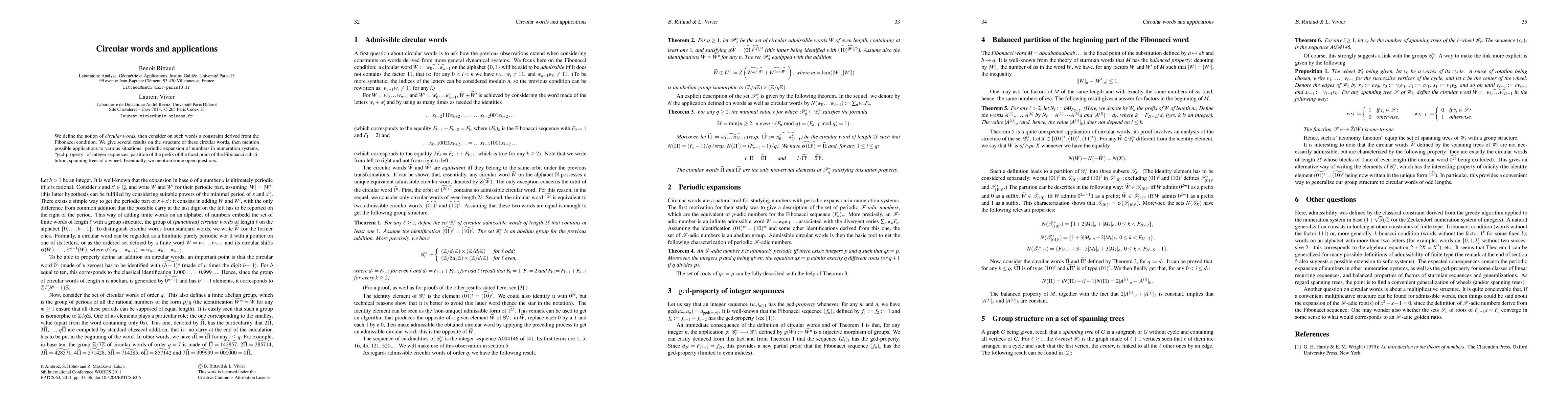 This paper introduces circular words and explores their structure under a Fibonacci-derived constraint, highlighting applications in numeration systems, integer sequences, and graph theory, while also noting open research questions.