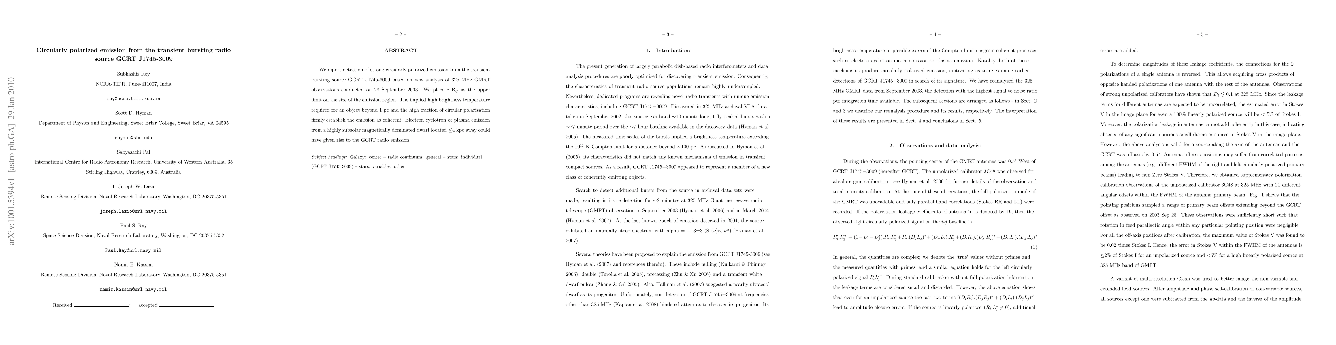 This paper reports the detection of strong circularly polarized emission from the transient radio source GCRT J1745-3009, suggesting coherent emission likely due to electron cyclotron or plasma processes. The study places an upper limit of 8 Solar radii on the emission region size.