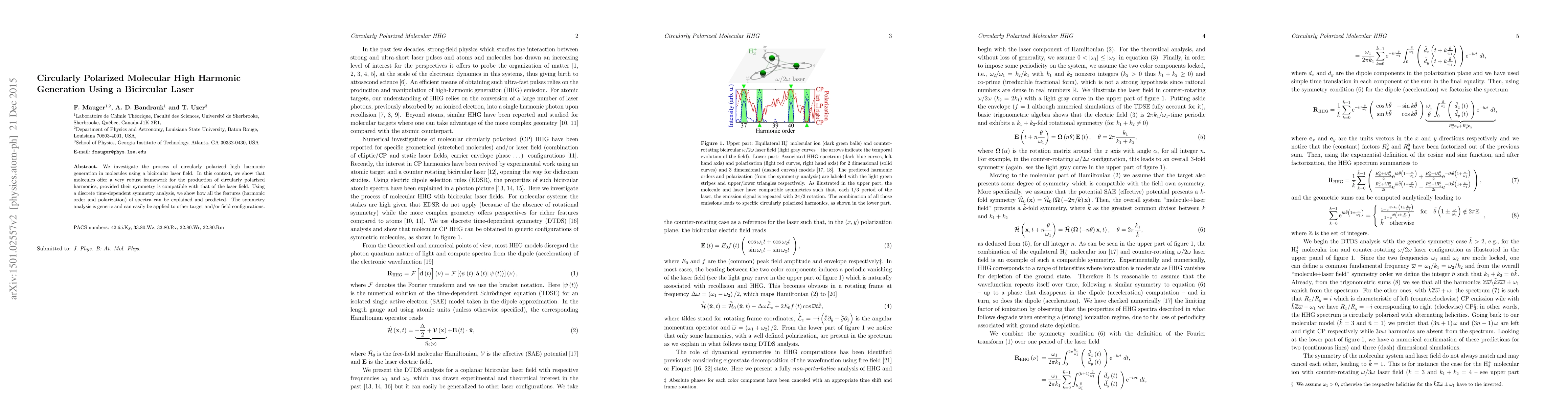 This paper explores circularly polarized high harmonic generation in molecules driven by a bicircular laser field, demonstrating that molecular symmetry compatibility with the laser field is crucial for generating circularly polarized harmonics. A discrete time-dependent symmetry analysis provides a method to explain and predict spectral features like harmonic order and polarization.