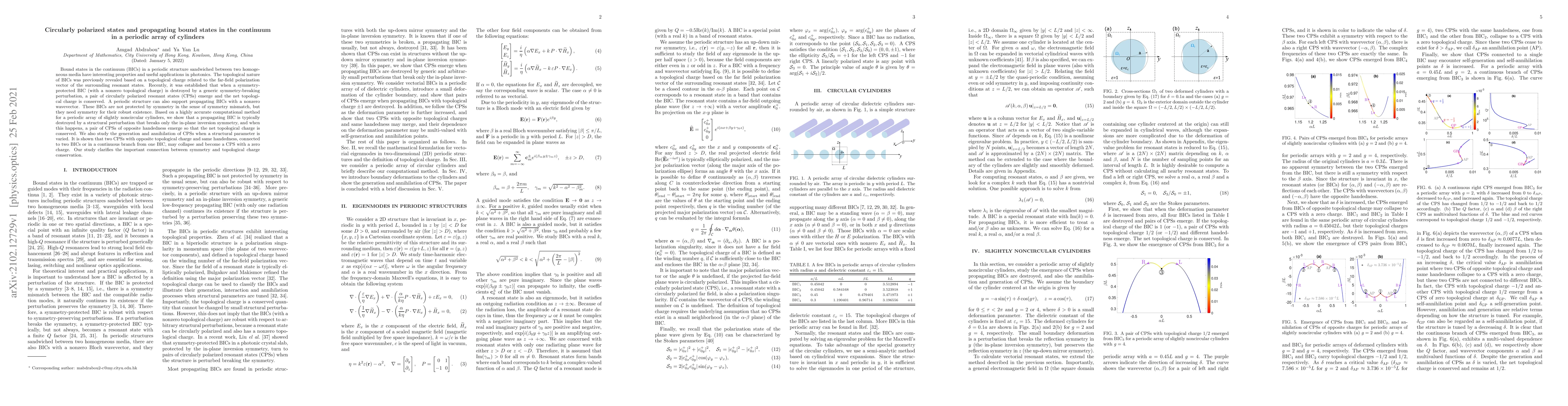 This paper investigates bound states in the continuum (BICs) in periodic arrays of cylinders, demonstrating how symmetry-breaking perturbations lead to the emergence of circularly polarized states (CPSs) while conserving topological charge. It also explores the conditions under which propagating BICs are destroyed and the dynamics of CPSs generation and annihilation.