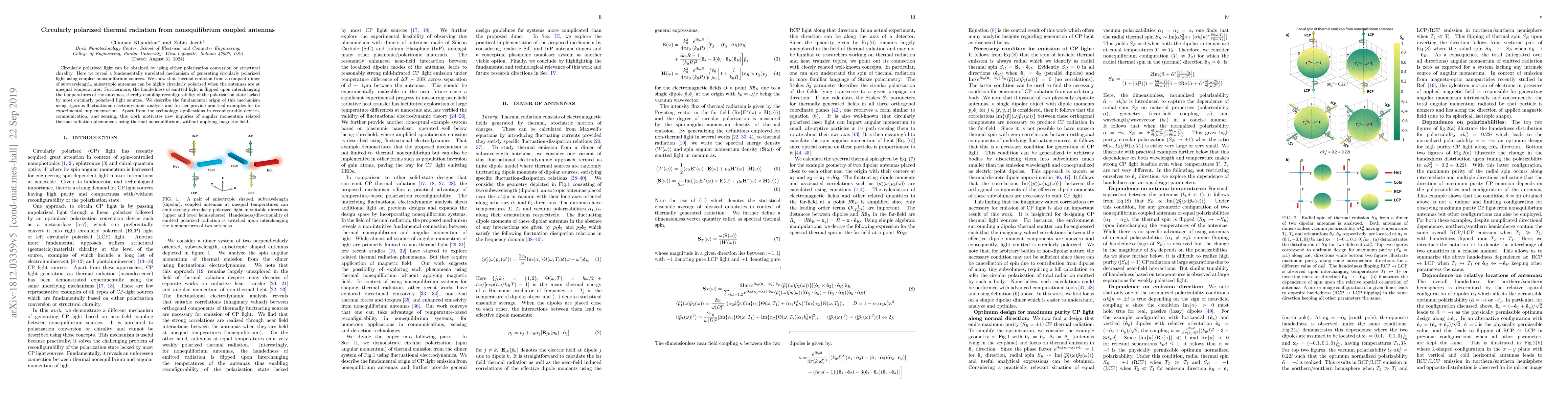 This paper demonstrates a novel method for generating circularly polarized thermal radiation using nonequilibrium coupled antennas at different temperatures. The study reveals that a compact dimer of subwavelength, anisotropic antennas can produce highly circularly polarized light, with the handedness flipping when the temperatures are interchanged, offering reconfigurable polarization without magnetic fields.