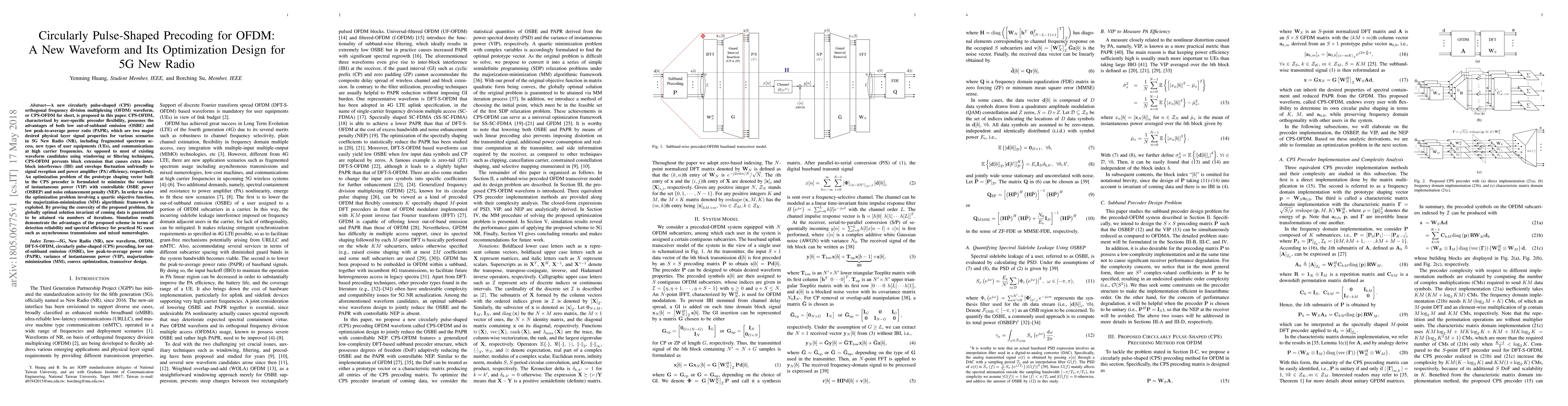 This paper proposes a new circularly pulse-shaped (CPS) precoding orthogonal frequency division multiplexing (OFDM) waveform, CPS-OFDM, which offers low out-of-subband emission and low peak-to-average power ratio, addressing key 5G NR requirements. An optimization framework using majorization-minimization is developed to minimize variance of instantaneous power, ensuring optimal performance across various 5G scenarios.