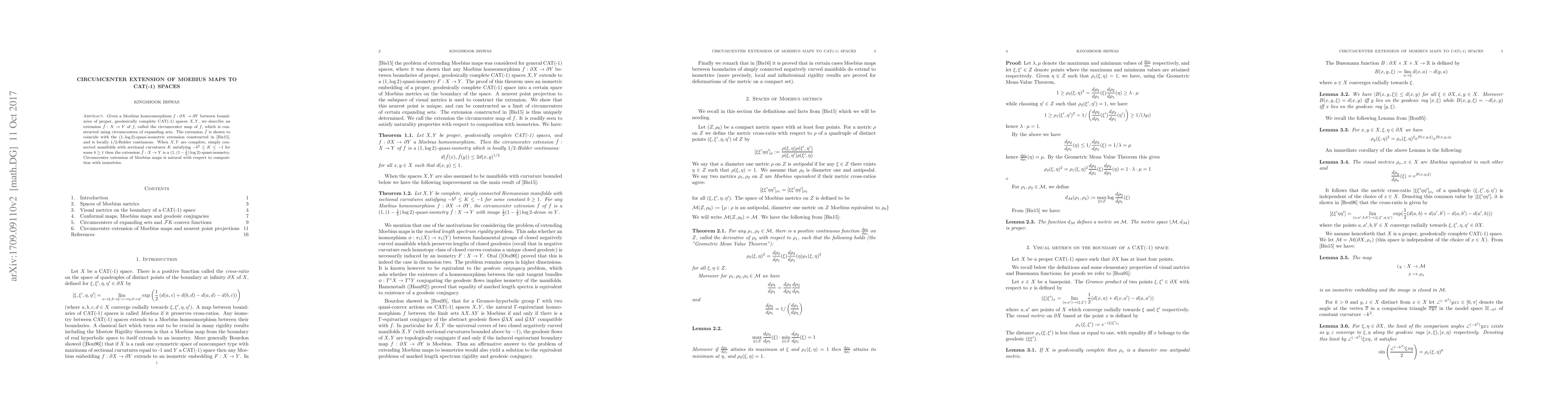 The paper describes the extension of Moebius maps to CAT(-1) spaces using circumcenters of expanding sets, proving its quasi-isometric properties and local Holder continuity.