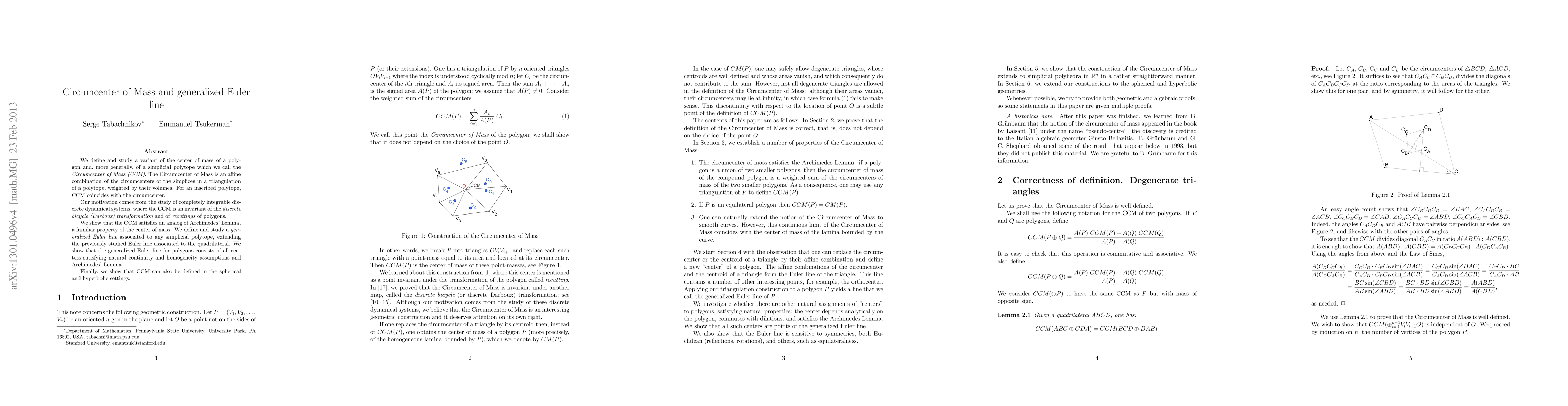 We define and study a variant of the center of mass of a polygon and, more generally, of a simplicial polytope which we call the Circumcenter of Mass (CCM). The Circumcenter of Mass is an affine combination of the circumcenters of the simplices in a triangulation of a polytope, weighted by their volumes. For an inscribed polytope, CCM coincides with the circumcenter. Our motivation comes from the study of completely integrable discrete dynamical systems, where the CCM is an invariant of the discrete bicycle (Darboux) transformation and of recuttings of polygons. We show that the CCM satisfies an analog of Archimedes' Lemma, a familiar property of the center of mass. We define and study a generalized Euler line associated to any simplicial polytope, extending the previously studied Euler line associated to the quadrilateral. We show that the generalized Euler line for polygons consists of all centers satisfying natural continuity and homogeneity assumptions and Archimedes' Lemma. Finally, we show that CCM can also be defined in the spherical and hyperbolic settings.