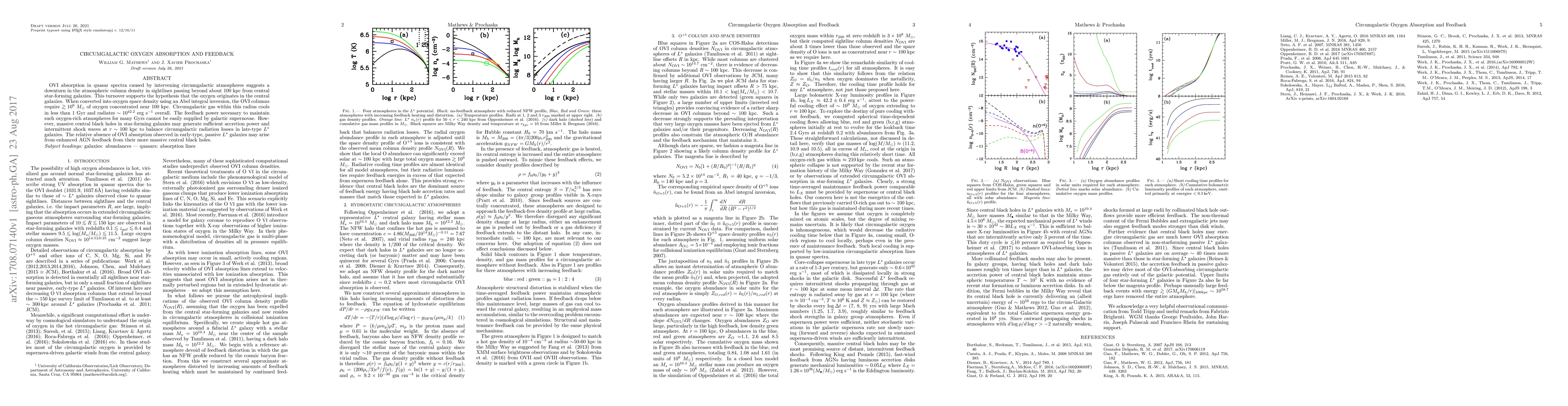 This paper investigates OVI absorption in quasar spectra, finding a decline in circumgalactic oxygen beyond 100 kpc from star-forming galaxies, suggesting oxygen originates from these galaxies. It concludes that supermassive black holes may provide the necessary feedback to sustain these oxygen-rich atmospheres, contrasting with the lack of OVI in early-type galaxies likely due to stronger AGN feedback.