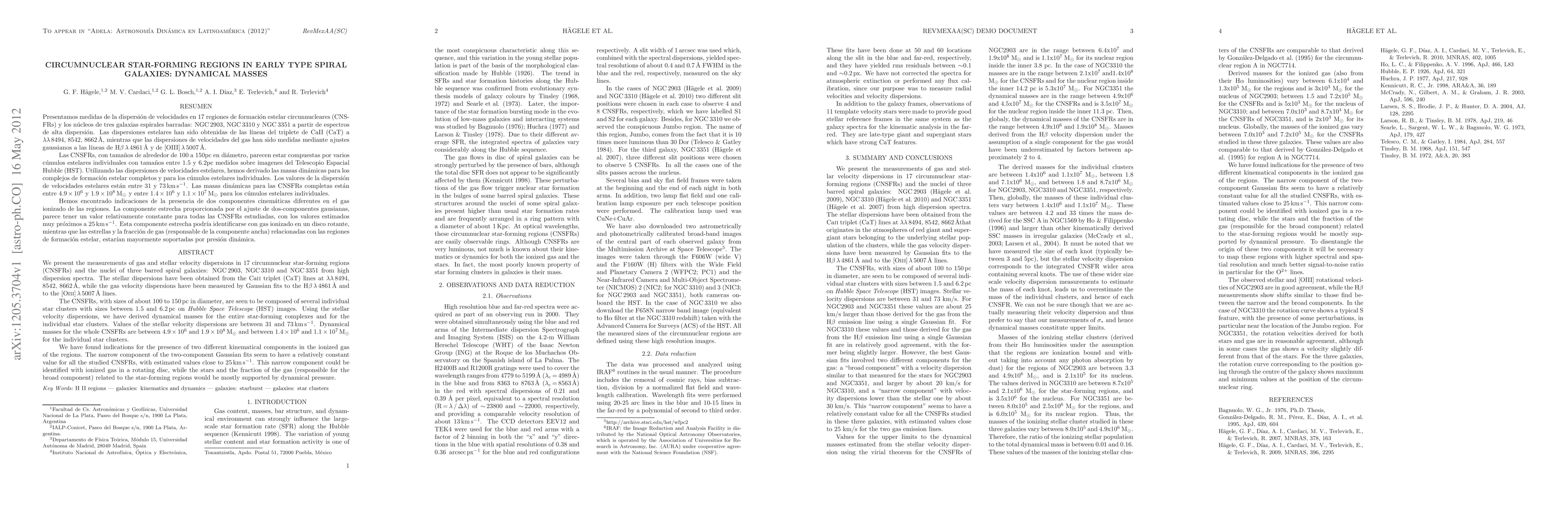 We present the measurements of gas and stellar velocity dispersions in 17 circumnuclear star-forming regions (CNSFRs) and the nuclei of three barred spiral galaxies: NGC2903, NGC3310 and NGC3351 from high dispersion spectra. The stellar dispersions have been obtained from the CaII triplet (CaT) lines at 8494, 8542, 8662A, while the gas velocity dispersions have been measured by Gaussian fits to the Hbeta and to the [OIII]5007A\ lines. The CNSFRs, with sizes of about 100 to 150pc in diameter, are seen to be composed of several individual star clusters with sizes between 1.5 and 6.2pc on HST images. Using the stellar velocity dispersions, we have derived dynamical masses for the entire star-forming complexes and for the individual star clusters. Values of the stellar velocity dispersions are between 31 and 73 km/s. Dynamical masses for the whole CNSFRs are between 4.9x10^6 and 1.9x10^8 Mo and between 1.4x10^6 and 1.1x10^7 Mo for the individual star clusters. We have found indications for the presence of two different kinematical components in the ionized gas of the regions. The narrow component of the two-component Gaussian fits seem to have a relatively constant value for all the studied CNSFRs, with estimated values close to 25 km/s. This narrow component could be identified with ionized gas in a rotating disc, while the stars and the fraction of the gas (responsible for the broad component) related to the star-forming regions would be mostly supported by dynamical pressure.