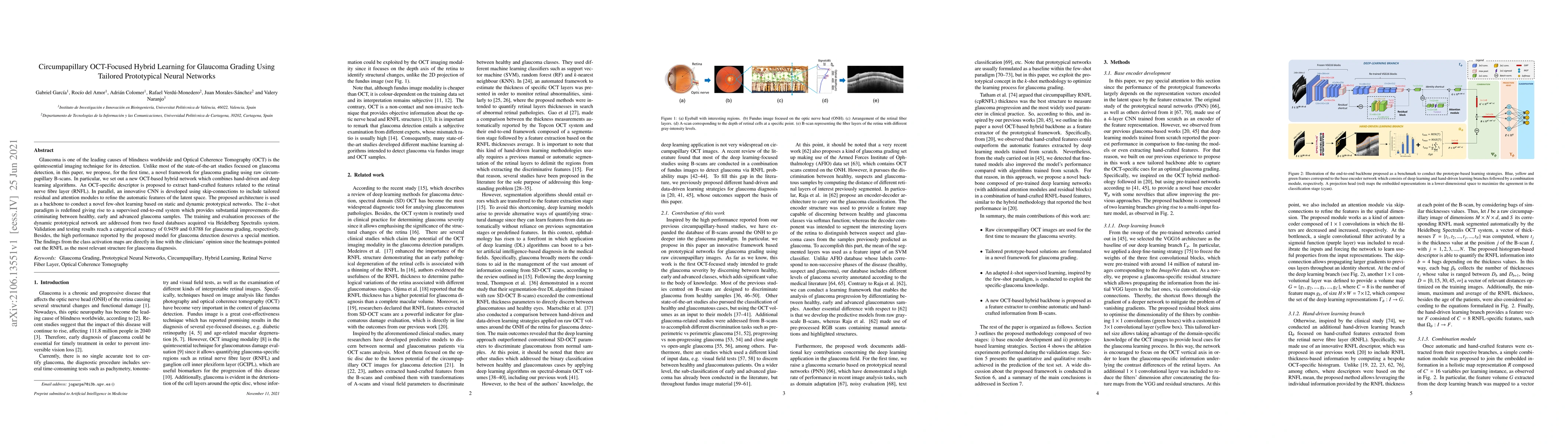 This research introduces a novel hybrid learning framework for glaucoma grading using Optical Coherence Tomography (OCT) scans. The proposed system combines hand-crafted features with a convolutional neural network to enhance feature extraction and employs a few-shot learning approach to improve classification accuracy. The model achieved significant results in distinguishing between different stages of glaucoma. For more details, refer directly to the original paper.
