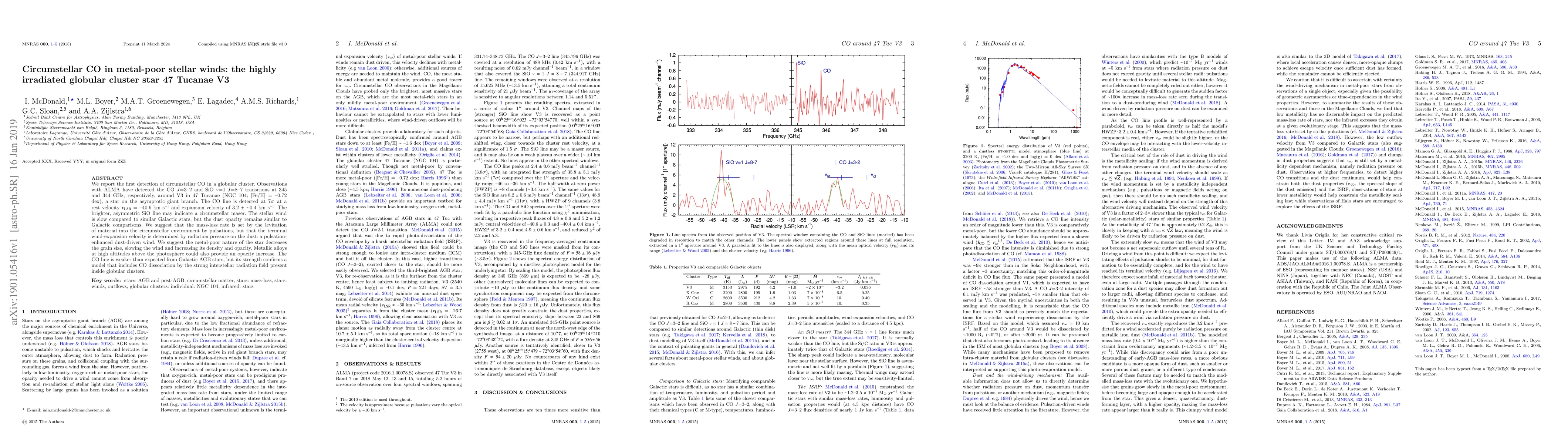 This paper reports the first detection of circumstellar CO in a globular cluster star, V3 in 47 Tucanae, using ALMA observations. The findings suggest a pulsation-enhanced dust-driven wind, with the metal-poor nature of the star influencing the wind's density and opacity.