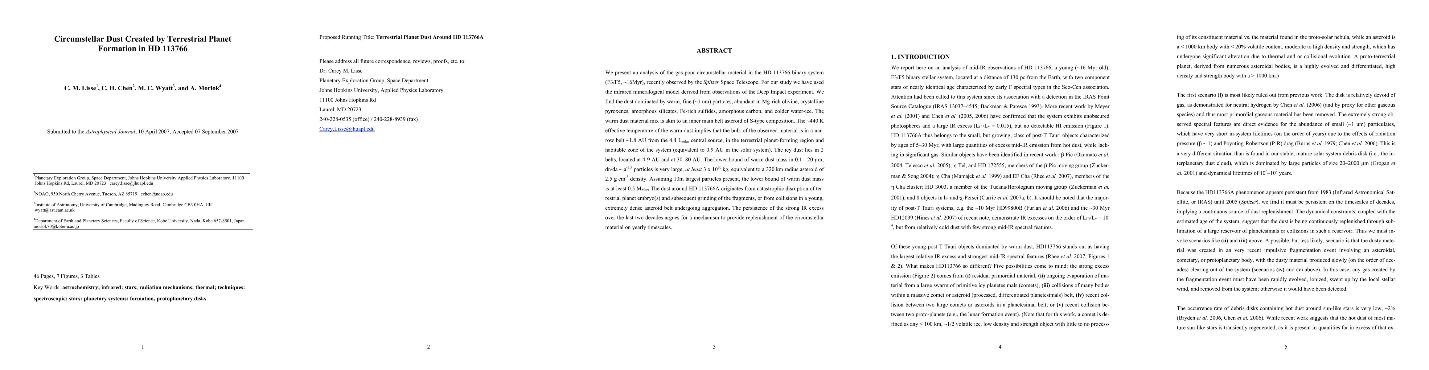 We present an analysis of the gas-poor circumstellar material in the HD 113766 binary system (F3/F5, 10 - 16 Myr), recently observed by the Spitzer Space Telescope. For our study we have used the infrared mineralogical model derived from observations of the Deep Impact experiment. We find the dust dominated by warm, fine (~1 um) particles, abundant in Mg-rich olivine, crystalline pyroxenes, amorphous silicates, Fe-rich sulfides, amorphous carbon, and colder water-ice. The warm dust material mix is akin to an inner main belt asteroid of S-type composition. The ~440 K effective temperature of the warm dust implies that the bulk of the observed material is in a narrow belt ~1.8 AU from the 4.4 L_solar central source, in the terrestrial planet-forming region and habitable zone of the system (equivalent to 0.9 AU in the solar system). The icy dust lies in 2 belts, located at 4-9 AU and at 30 - 80 AU. The lower bound of warm dust mass in 0.1 - 20 um, dn/da ~ a^-3.5 particles is very large, at least 3 x 10^20 kg, equivalent to a 320 km radius asteroid of 2.5 g cm^-3 density. Assuming 10m largest particles present, the lower bound of warm dust mass is at least 0.5 M_Mars The dust around HD 113766A originates from catastrophic disruption of terrestrial planet embryo(s) and subsequent grinding of the fragments, or from collisions in a young, extremely dense asteroid belt undergoing aggregation. The persistence of the strong IR excess over the last two decades argues for a mechanism to provide replenishment of the circumstellar material on yearly timescales.