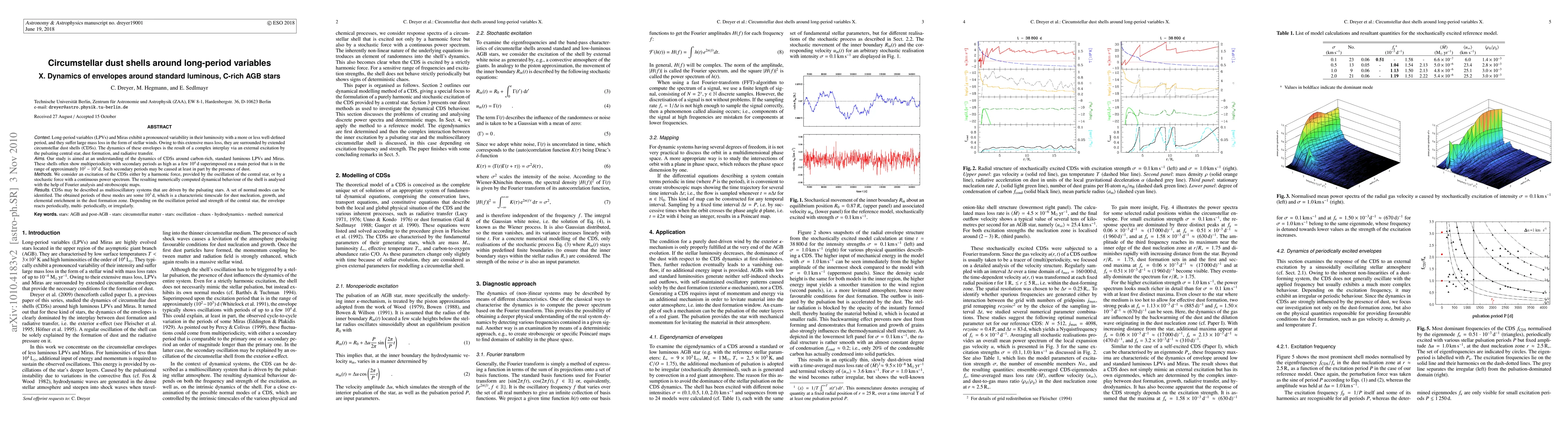 Long-period variables (LPVs) and Miras are highly evolved stars at the upper region of the asymptotic giant branch. They exhibit a pronounced variability of their luminosity with a more or less well defined period and suffer large mass loss in the form of stellar winds. Due to this extensive mass loss, LPVs and Miras are surrounded by extended circumstellar dust shells (CDSs). The dynamics of these envelopes is the result of a complex interplay via an external excitation by the pulsating central star, dust formation and radiative transfer. Our study is aimed at an understanding of the dynamics of CDSs around carbon-rich, standard luminous LPVs and Miras. These shells often show multiperiodicity with secondary periods as high as a few 10^4 d superimposed on a main period which is in the range of approximately 10^2-10^3 d. Such secondary periods may be caused at least in part by the presence of dust. We consider an excitation of the CDSs by either a harmonic force, provided by the oscillation of the central star, or by a stochastic force with a continuous power spectrum. The resulting numerically computed dynamical behaviour of the shell is analysed with the help of Fourier analysis and stroboscopic maps. CDSs may be described as multioscillatory systems which are driven by the pulsating stars. A set of normal modes can be identified. The obtained periods of these modes are of the order of some 10^3 d, which is a characteristic timescale for dust nucleation, growth and elemental enrichment in the dust formation zone. Depending on the oscillation period and strength of the central star, the envelope reacts periodically, multi- periodically or irregularly.