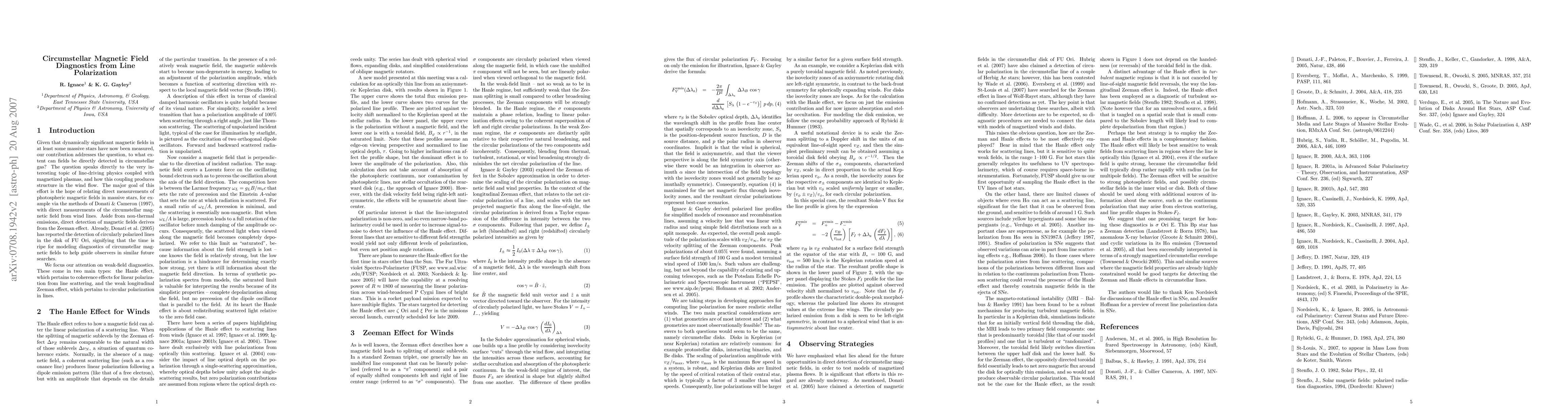 This paper investigates the detection of circumstellar magnetic fields through weak-field diagnostics, specifically the Hanle effect for linear polarization and the weak longitudinal Zeeman effect for circular polarization, to understand the dynamics of magnetized plasmas in massive star winds.
