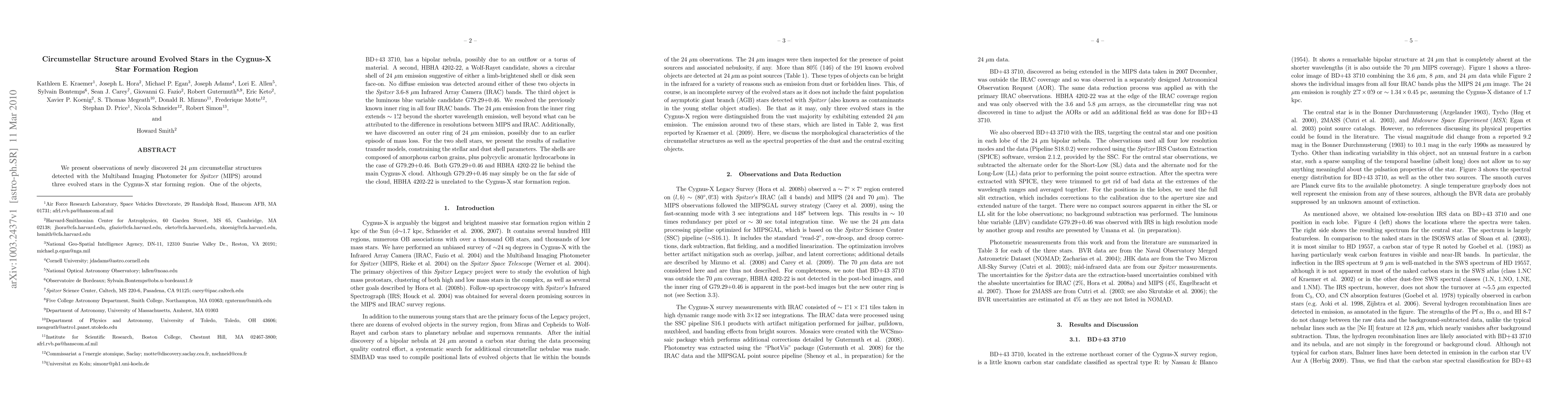 This study uses Spitzer observations to reveal 24 micron circumstellar structures around three evolved stars in the Cygnus-X region, including a bipolar nebula around BD+43 3710 and a circular shell around HBHA 4202-22, suggesting different mass-loss mechanisms. The luminous blue variable G79.29+0.46 shows an extended inner ring and an outer ring of 24 micron emission.