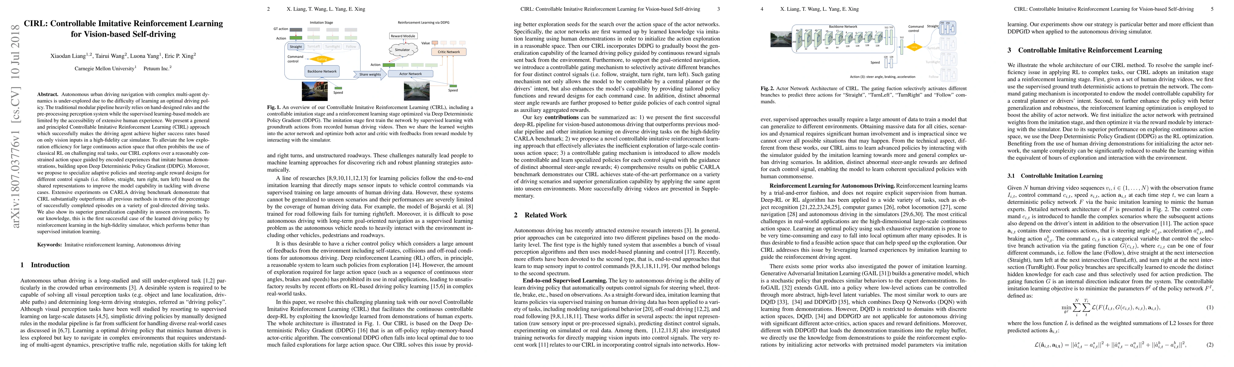 The paper introduces Controllable Imitative Reinforcement Learning (CIRL) for vision-based self-driving, achieving higher success rates in a high-fidelity simulator. CIRL addresses the challenges of large continuous action spaces and complex multi-agent dynamics by imitating human demonstrations, outperforming previous methods on CARLA driving benchmark.
