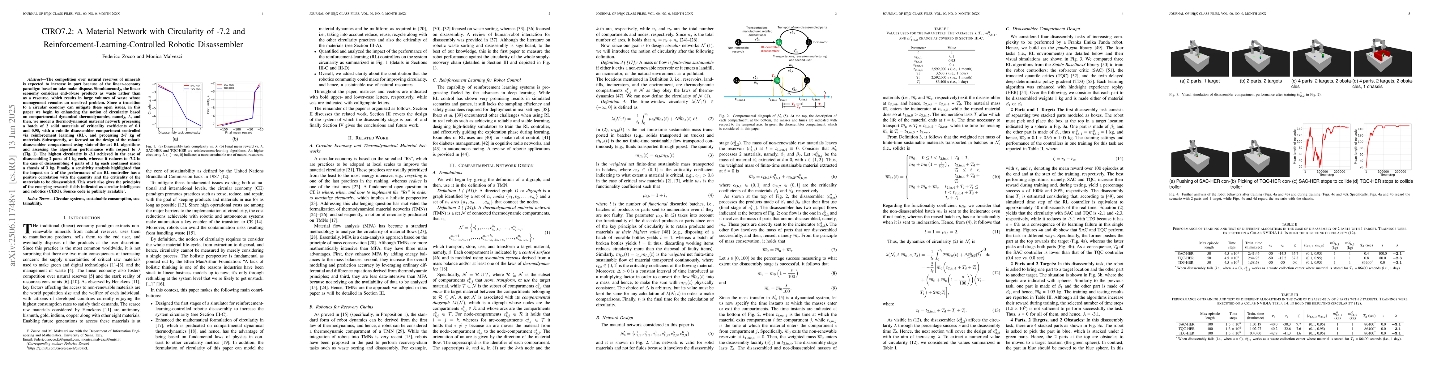 The competition over natural reserves of minerals is expected to increase in part because of the linear-economy paradigm based on take-make-dispose. Simultaneously, the linear economy considers end-of-use products as waste rather than as a resource, which results in large volumes of waste whose management remains an unsolved problem. Since a transition to a circular economy can mitigate these open issues, in this paper we begin by enhancing the notion of circularity based on compartmental dynamical thermodynamics, namely, $\lambda$, and then, we model a thermodynamical material network processing a batch of 2 solid materials of criticality coefficients of 0.1 and 0.95, with a robotic disassembler compartment controlled via reinforcement learning (RL), and processing 2-7 kg of materials. Subsequently, we focused on the design of the robotic disassembler compartment using state-of-the-art RL algorithms and assessing the algorithm performance with respect to $\lambda$ (Fig. 1). The highest circularity is -2.1 achieved in the case of disassembling 2 parts of 1 kg each, whereas it reduces to -7.2 in the case of disassembling 4 parts of 1 kg each contained inside a chassis of 3 kg. Finally, a sensitivity analysis highlighted that the impact on $\lambda$ of the performance of an RL controller has a positive correlation with the quantity and the criticality of the materials to be disassembled. This work also gives the principles of the emerging research fields indicated as circular intelligence and robotics (CIRO). Source code is publicly available.