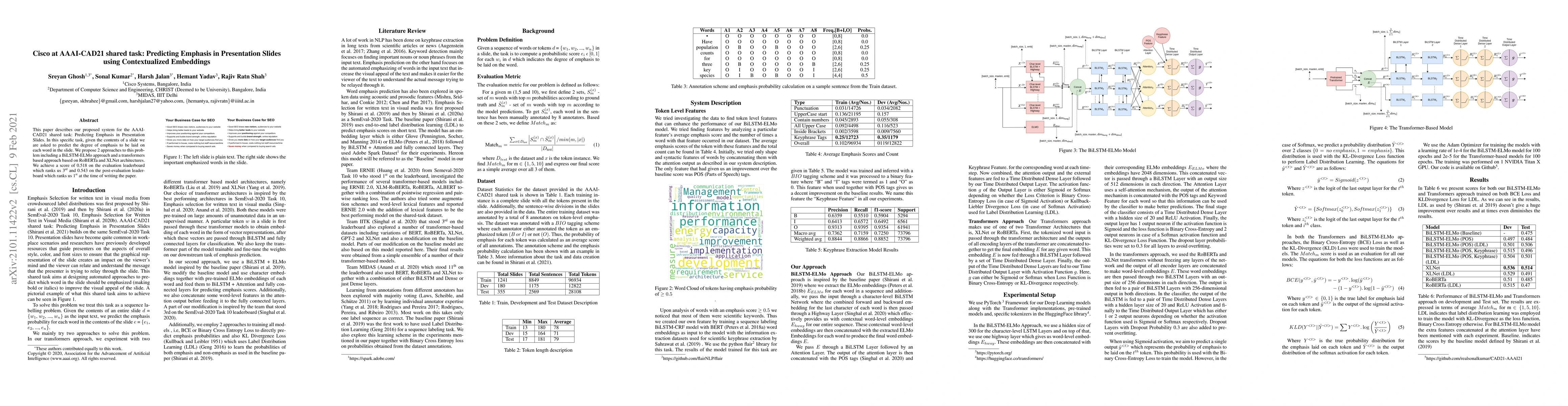 This paper describes our proposed system for the AAAI-CAD21 shared task: Predicting Emphasis in Presentation Slides. In this specific task, given the contents of a slide we are asked to predict the degree of emphasis to be laid on each word in the slide. We propose 2 approaches to this problem including a BiLSTM-ELMo approach and a transformers based approach based on RoBERTa and XLNet architectures. We achieve a score of 0.518 on the evaluation leaderboard which ranks us 3rd and 0.543 on the post-evaluation leaderboard which ranks us 1st at the time of writing the paper.