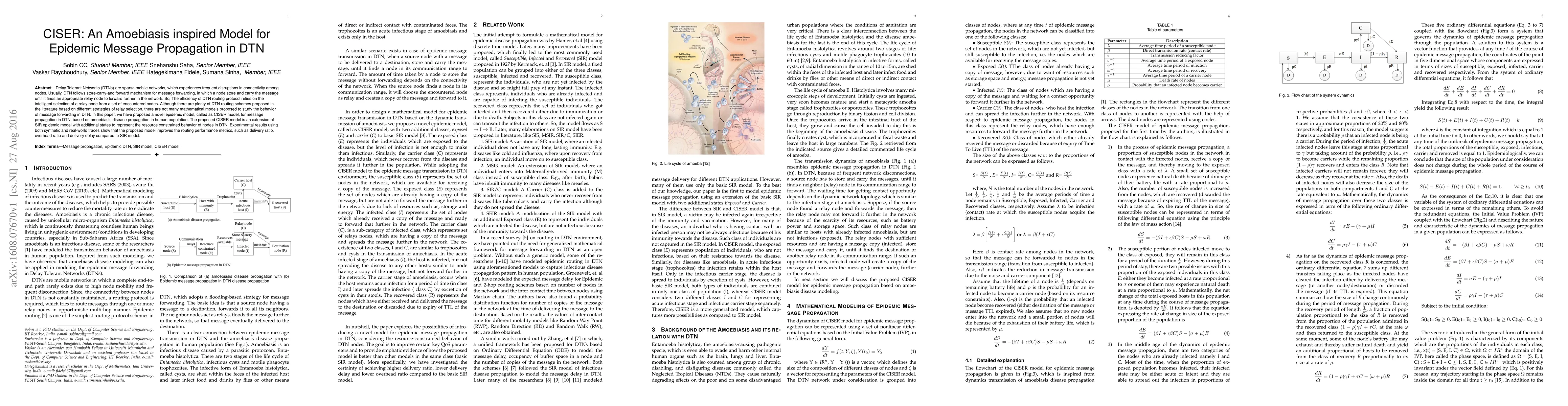 The paper proposes a novel CISER epidemic model for message propagation in Delay Tolerant Networks (DTN), inspired by the spread of amoebiasis. The CISER model extends the SIR model to better account for resource constraints in DTN nodes, and experimental results show improved routing performance metrics.