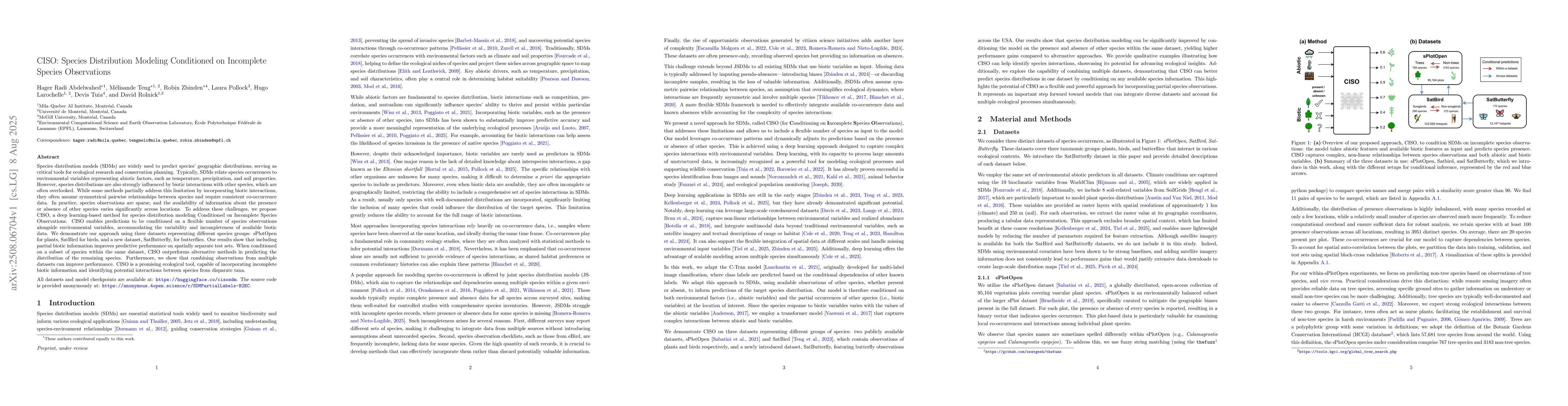 CISO introduces a deep learning architecture that non-linearly integrates partial biotic information with abiotic environmental variables for species distribution modeling.