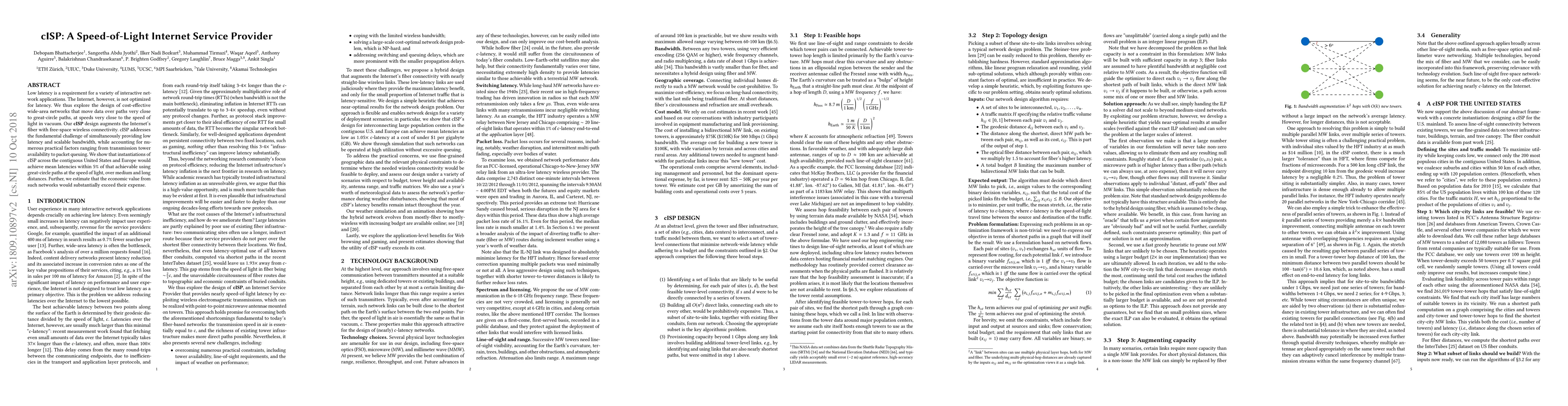 Low latency is a requirement for a variety of interactive network applications. The Internet, however, is not optimized for latency. We thus explore the design of cost-effective wide-area networks that move data over paths very close to great-circle paths, at speeds very close to the speed of light in vacuum. Our cISP design augments the Internet's fiber with free-space wireless connectivity. cISP addresses the fundamental challenge of simultaneously providing low latency and scalable bandwidth, while accounting for numerous practical factors ranging from transmission tower availability to packet queuing. We show that instantiations of cISP across the contiguous United States and Europe would achieve mean latencies within 5% of that achievable using great-circle paths at the speed of light, over medium and long distances. Further, we estimate that the economic value from such networks would substantially exceed their expense.