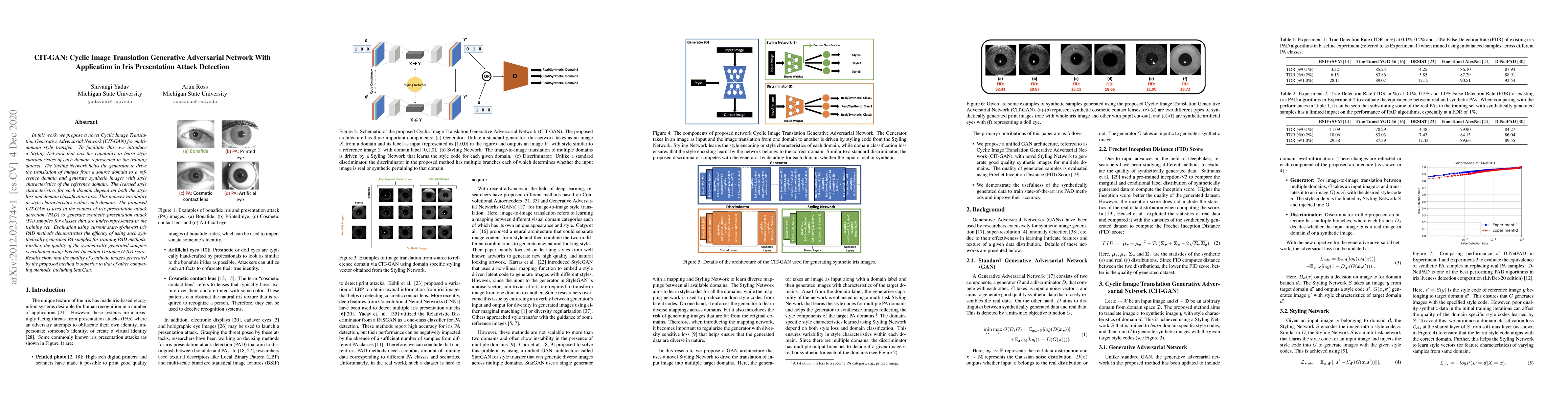 The paper proposes a Cyclic Image Translation Generative Adversarial Network (CIT-GAN) with a Styling Network for multi-domain style transfer, which is applied to generate synthetic presentation attack samples for iris presentation attack detection. The method shows superior synthetic image quality compared to other GANs, as demonstrated by lower Frechet Inception Distance scores.