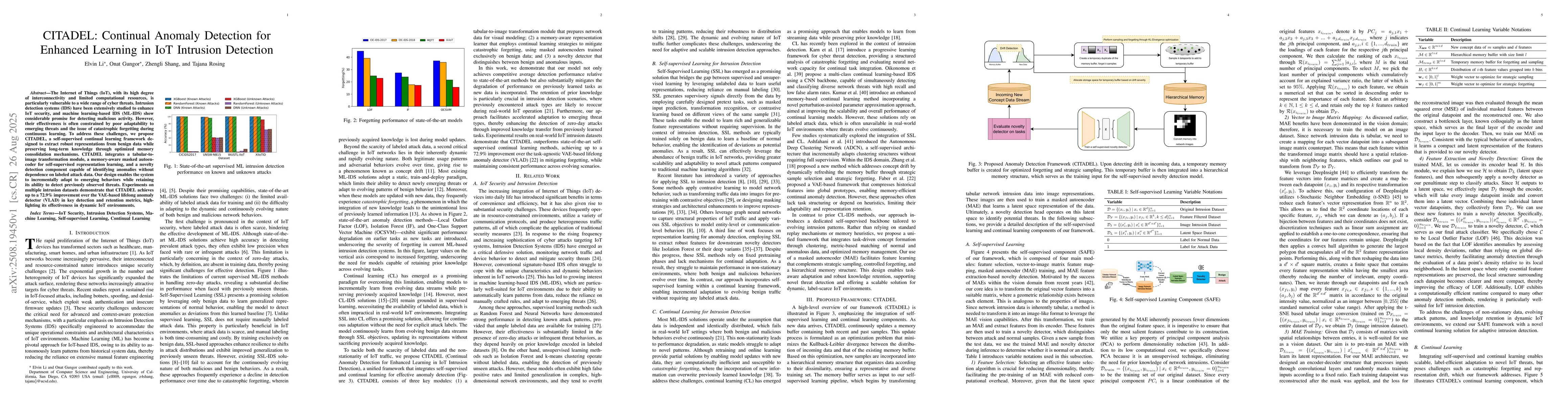 The Internet of Things (IoT), with its high degree of interconnectivity and limited computational resources, is particularly vulnerable to a wide range of cyber threats. Intrusion detection systems (IDS) have been extensively studied to enhance IoT security, and machine learning-based IDS (ML-IDS) show considerable promise for detecting malicious activity. However, their effectiveness is often constrained by poor adaptability to emerging threats and the issue of catastrophic forgetting during continuous learning. To address these challenges, we propose CITADEL, a self-supervised continual learning framework designed to extract robust representations from benign data while preserving long-term knowledge through optimized memory consolidation mechanisms. CITADEL integrates a tabular-to-image transformation module, a memory-aware masked autoencoder for self-supervised representation learning, and a novelty detection component capable of identifying anomalies without dependence on labeled attack data. Our design enables the system to incrementally adapt to emerging behaviors while retaining its ability to detect previously observed threats. Experiments on multiple intrusion datasets demonstrate that CITADEL achieves up to a 72.9% improvement over the VAE-based lifelong anomaly detector (VLAD) in key detection and retention metrics, highlighting its effectiveness in dynamic IoT environments.
