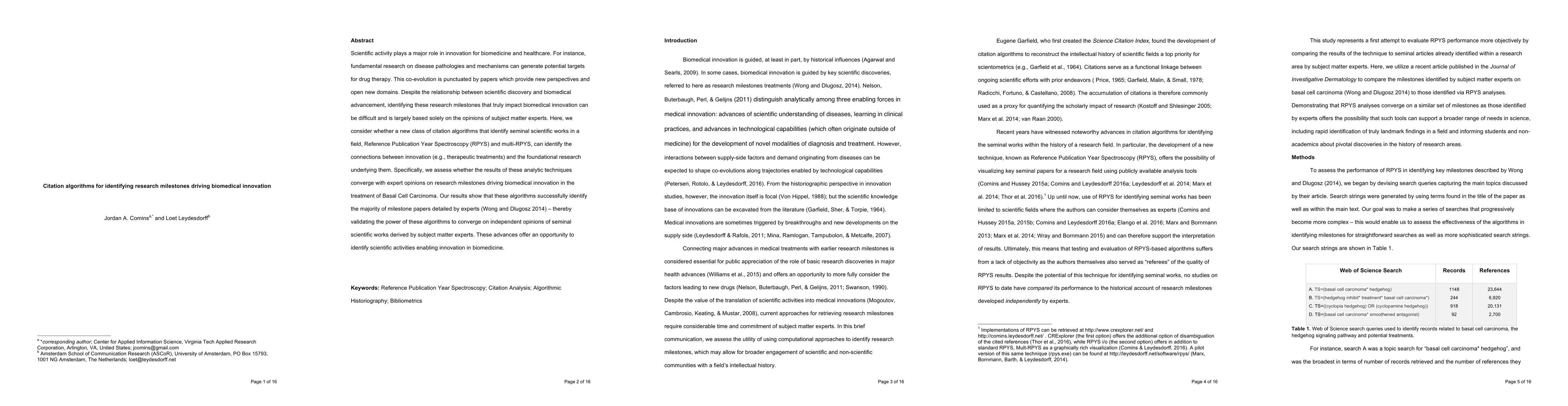 Scientific activity plays a major role in innovation for biomedicine and healthcare. For instance, fundamental research on disease pathologies and mechanisms can generate potential targets for drug therapy. This co-evolution is punctuated by papers which provide new perspectives and open new domains. Despite the relationship between scientific discovery and biomedical advancement, identifying these research milestones that truly impact biomedical innovation can be difficult and is largely based solely on the opinions of subject matter experts. Here, we consider whether a new class of citation algorithms that identify seminal scientific works in a field, Reference Publication Year Spectroscopy (RPYS) and multi-RPYS, can identify the connections between innovation (e.g. therapeutic treatments) and the foundational research underlying them. Specifically, we assess whether the results of these analytic techniques converge with expert opinions on research milestones driving biomedical innovation in the treatment of Basal Cell Carcinoma. Our results show that these algorithms successfully identify the majority of milestone papers detailed by experts (Wong and Dlugosz 2014) thereby validating the power of these algorithms to converge on independent opinions of seminal scientific works derived by subject matter experts. These advances offer an opportunity to identify scientific activities enabling innovation in biomedicine.