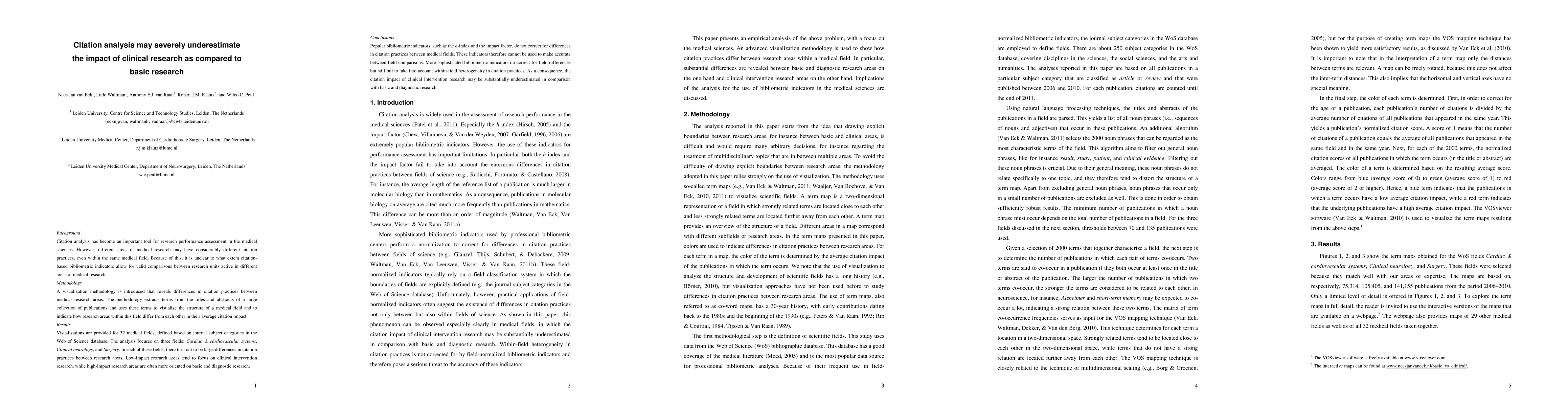 This paper argues that citation analysis underestimates the impact of clinical research compared to basic research due to differing citation practices across medical fields. The study introduces a visualization method to highlight these differences, revealing that clinical intervention research often receives lower citation impact than basic and diagnostic research, despite its importance.